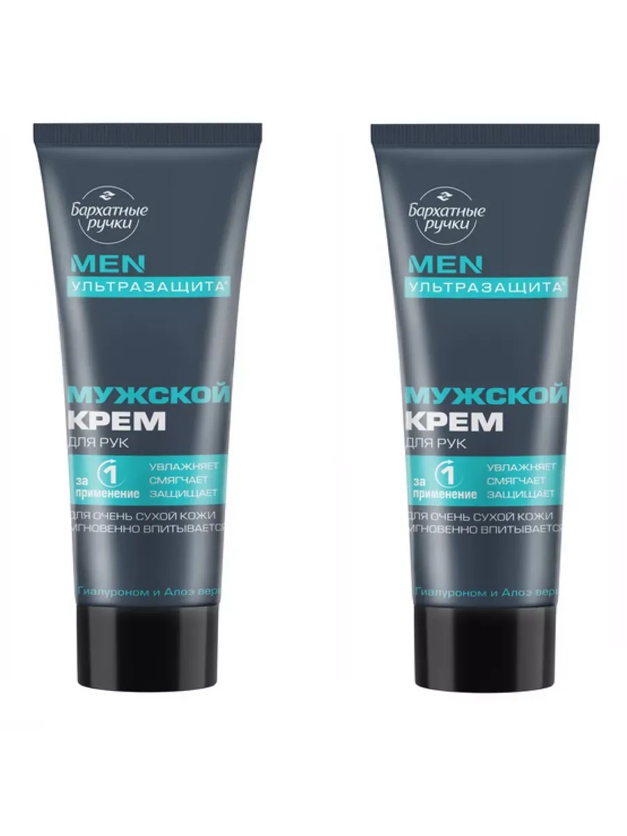 Бархатные ручки, Крем мужской для рук 80 мл, 2 шт. Новинка Бархатные ручки – мужской крем для рук – смягчает кожу и устраняет стянутость всего за одно применение. Устраняет шелушение и восстанавливает даже очень сухую кожу рук. Гиалурон интенсивно увлажняет, алоэ вера смягчает и успокаивает. Крем мгновенно впитывается, не оставляя жирной пленки. Подходит для ежедневного ухода.