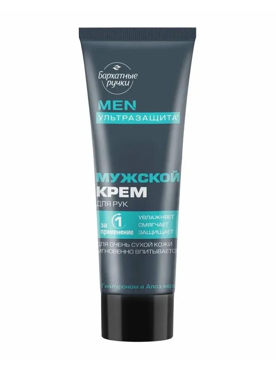 Бархатные Ручки Мужской крем для рук с гиалуроном и алоэ вера, 80 мл специально для ухода за мужскими руками эксперты бренда Бархатные ручки разработали долгожданную новинку – крем Ультразащита. Руки мужчин постоянно в деле: ремонтируют, носят тяжести, зачастую контактируют без перчаток с бытовой химией. Результат: грубая сухая кожа. Мужской крем для рук Бархатные ручки смягчает всего за одно применение, восстанавливает даже очень сухую кожу рук и устраняет шелушение! Активные ингредиенты в составе комплексно воздействую на кожу: • Гиалурон интенсивно увлажняет и создает на поверхности невидимый слой, который помогает контролировать испарение влаги. • Алоэ вера смягчает и успокаивает. • Масла ши и миндаля разглаживают и питают. Мужской крем Ультразащита мгновенно впитывается, не оставляя жирной пленки. Им удобно пользоваться как дома, так и вне его. Объем 80 мл можно положить в машину или оставить на работе. Для наилучшего результата наносите утром перед выходом на улицу, в течение дня по мере необходимости – например, до и после ремонтных, хозяйственных, садовых работ, после мытья рук, вечером перед сном. Подходит для ежедневного ухода. Легкий свежий аромат приятен при нанесении, при этом 'сидит' близко к коже и не перебивает аромат вашего парфюма.