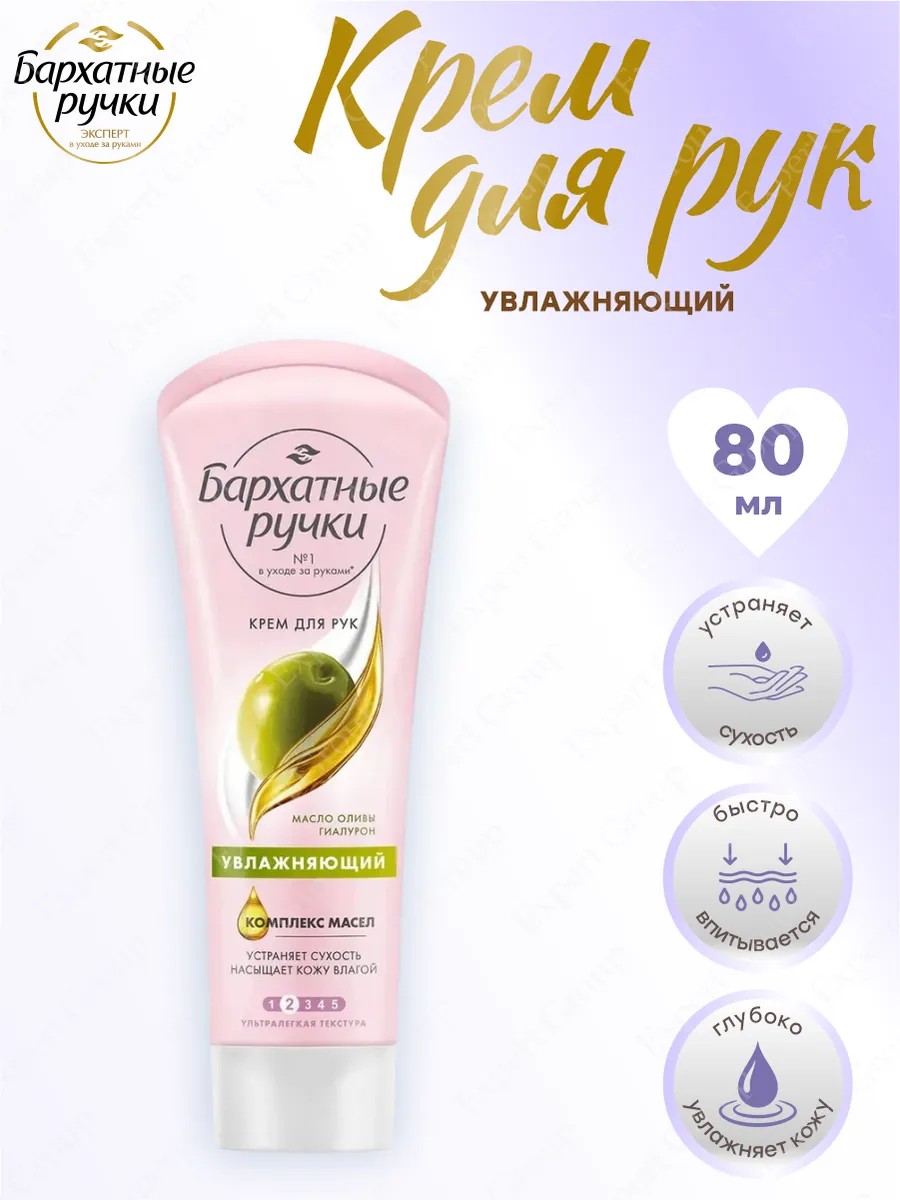 Крем для рук Бархатные ручки Увлажняющий 80 мл. Формула крема с маслом оливы и гиалуроном насыщает кожу влагой, защищает от сухости и шелушения в течение дня, восстанавливает сухую кожу рук. Комплекс масел интенсивно увлажняет, смягчает, предотвращает появление сухости. Аллантоин оказывает смягчающее и увлажняющее действие. Гиалурон сохраняет влагу в коже, устраняя сухость и стянутость. Текстура быстро впитывается, не оставляет липкости и жирной пленки.