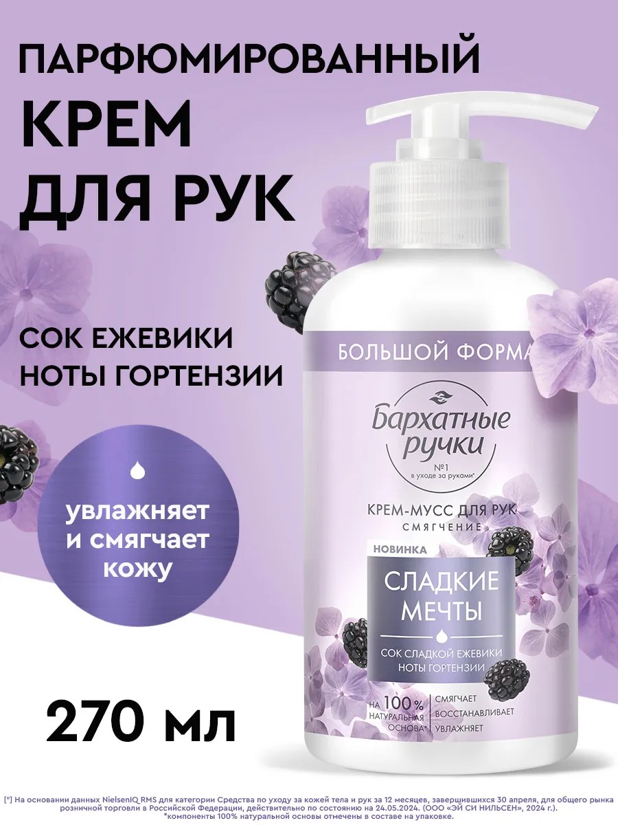 | Полное наименование товара | Бархатные ручки Крем для рук увлажняющий для сухой кожи, парфюмированный с дозатором, 270 мл |