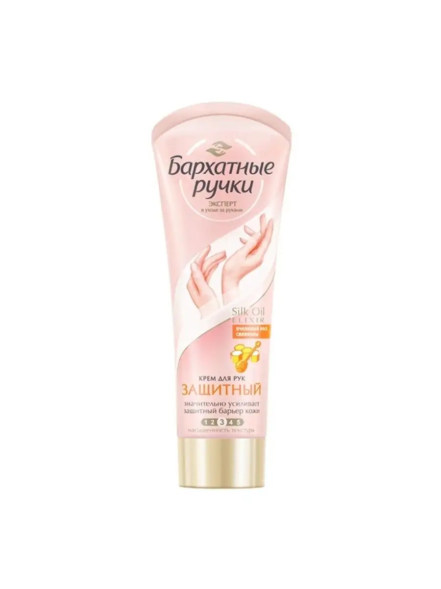 Крем для рук Бархатные ручки защитный, 80 мл (34481396). Крем для рук Бархатные ручки Защитный 80 мл. Специальная формула крема разработана для защиты кожи рук от влияния внешних факторов (ветер, холод, сухой воздух). Комплекс эффективно действующих компонентов обладает восстанавливающим действием, смягчает кожу, предотвращает появление сухости и шелушения. Действие крема усилено формулой Silk oil elixir. Микро - масла восстанавливают клетки кожи, и в комплексе с протеинами шелка делают ее мягкой и нежной. Красота и нежность Ваших рук в каждом прикосновении! Способ применения: наносите на чистую сухую кожу, легко массируя до полного впитывания. Используйте по мере необходимости. Состав: Aqua, Caprylic / Capric Triglyceride, Cyclopentasiloxane, sopropyl Isostearate, Isopropyl Myristate, Ethylhexyl Stearate, Glycerin, Glyceryl Stearate, Citrate, PEG - 12, Dimethicone, Prunus Amygdalus Dulcis (Sweet Almond) Oil, Glyceryl Stearate, Butyrospermum Parkii (Shea Butter), Cetearyl Alcohol, Potassium Cetyl Phosphate, Betaine, Disodium Cetearyl Sulfosuccinate, Acrylates / C10 - 30 Alkyl Acrylate Crosspolymer, Triethanolamine, Hydrolyzed Silk, Tocopheryl Acetate, Sodium Ascorbyl Phosphate, Maris Sal, Propylen Glycol, Sorbitol, Carboxymethyl Chitin Liquid, Panthenol, Sodium Hyaluronate, PEG - 40 Hydrogenated Castor Oil, Disodium EDTA, Methyparaben, Ethylparaben, DMDM Hydantoin, Phenoxyethanol, Potassium Sorbate, Parfum, Hydroxyisohexyl 3 - Cyclohexene Carboxaldehyde