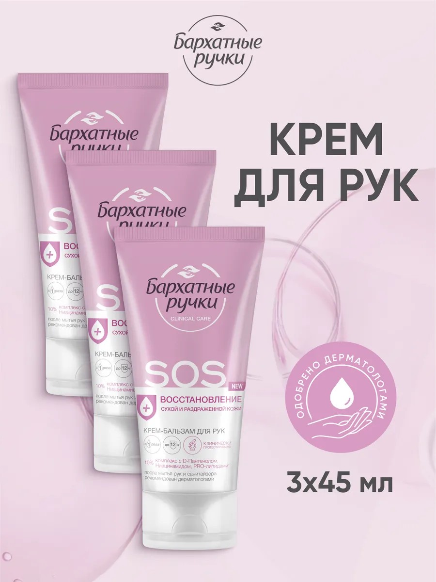 Крем-бальзам для рук SOS восстановление Бархатные ручки. В наборе 3 тюбика по 45 мл. Средство устраняет причины появления сухости, быстро восстанавливает и надолго смягчает. Разрешено для очень сухой и потрескавшейся кожи. Активная концентрация витаминов, пантенола, экстракта алое-вера. Действующие ингредиенты тонизируют, увлажняют, стимулируют выработку коллагена, образуют на коже воздухопроницаемый защитный слой. Сохраняет свою эффективность даже после мытья рук. Мгновенно впитывается без жирной пленки. Подходит для ежедневного применения.