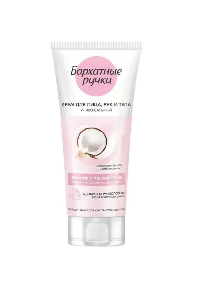 Бархатные Ручки, Крем для рук, лица, тела универсальный, питание увлажнение, 200мл, 1 шт. С маслом кокоса и витаминами А и Е быстро впитывается без жирности и липкости. Кокосовое масло увлажняет и питает, устраняет сухость, делая кожу мягкой и гладкой. Витамины А и Е восстанавливают гладкость, тонизируют и придают коже естественное сияние. Витамин Е – мощный антиоксидант, поддерживающий собственные защитные функции кожи, а витамин А способствует восстановлению и сохранению ее упругости и эластичности. Крем не содержит красителей и спирта. Универсальная формула подходит даже для чувствительной кожи. Питает и восстанавливает кожу лица, рук и тела. Способ применения: Наносите крем на чистую сухую кожу легкими массирующими движениями.