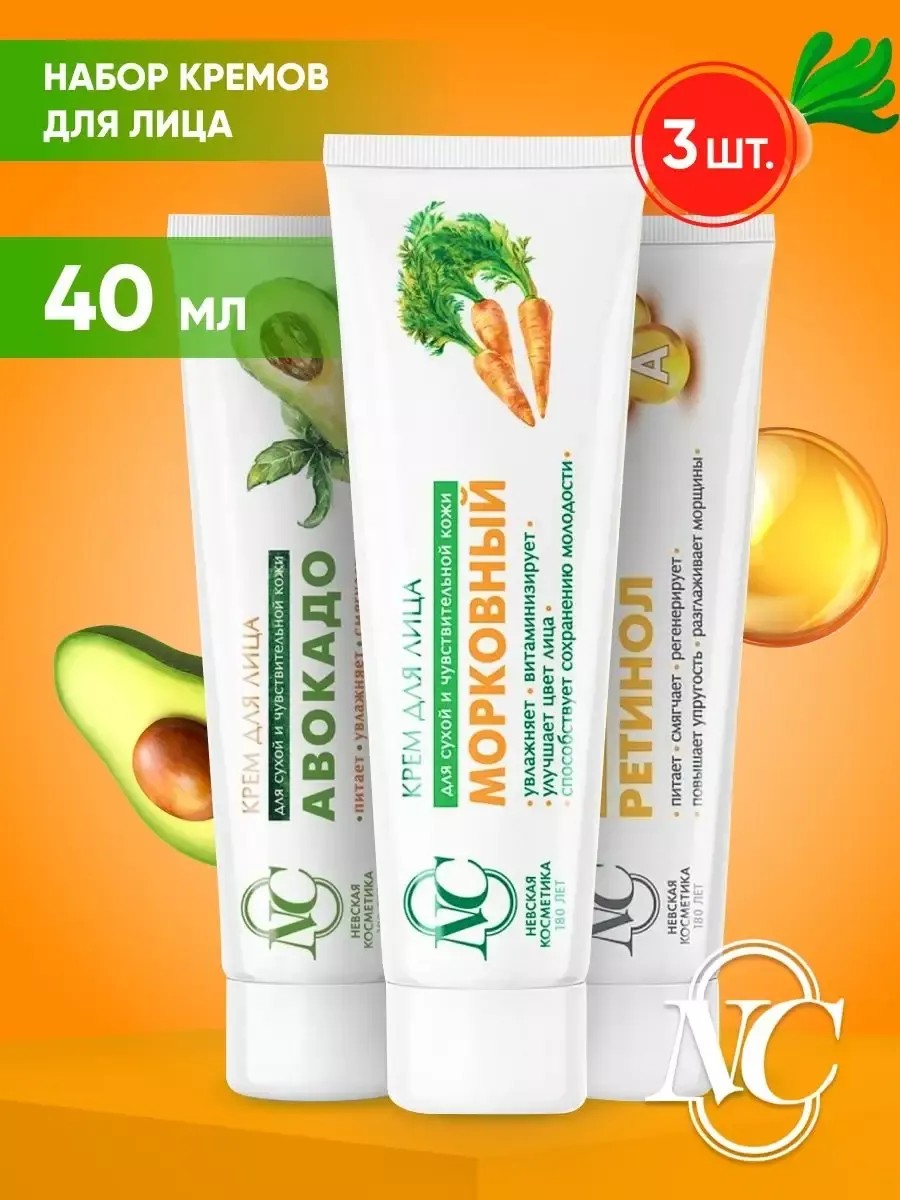 Набор кремов для лица Невская Косметика Смягчение и Увлажнение, 3 шт. по 40 мл состоит из трех уходовых средств, предназначенных для ежедневного применения. Крем Ретинол повышает регенерацию кожного покрова и способствует выравниванию кожи и улучшению ее цвета. Морковный крем смягчает, устраняет неприятное шелушение, тонизирует и оставляет после себя свежесть. Крем Авокадо придает эпидермису здоровый вид и восстанавливает гидролипидный баланс кожи.