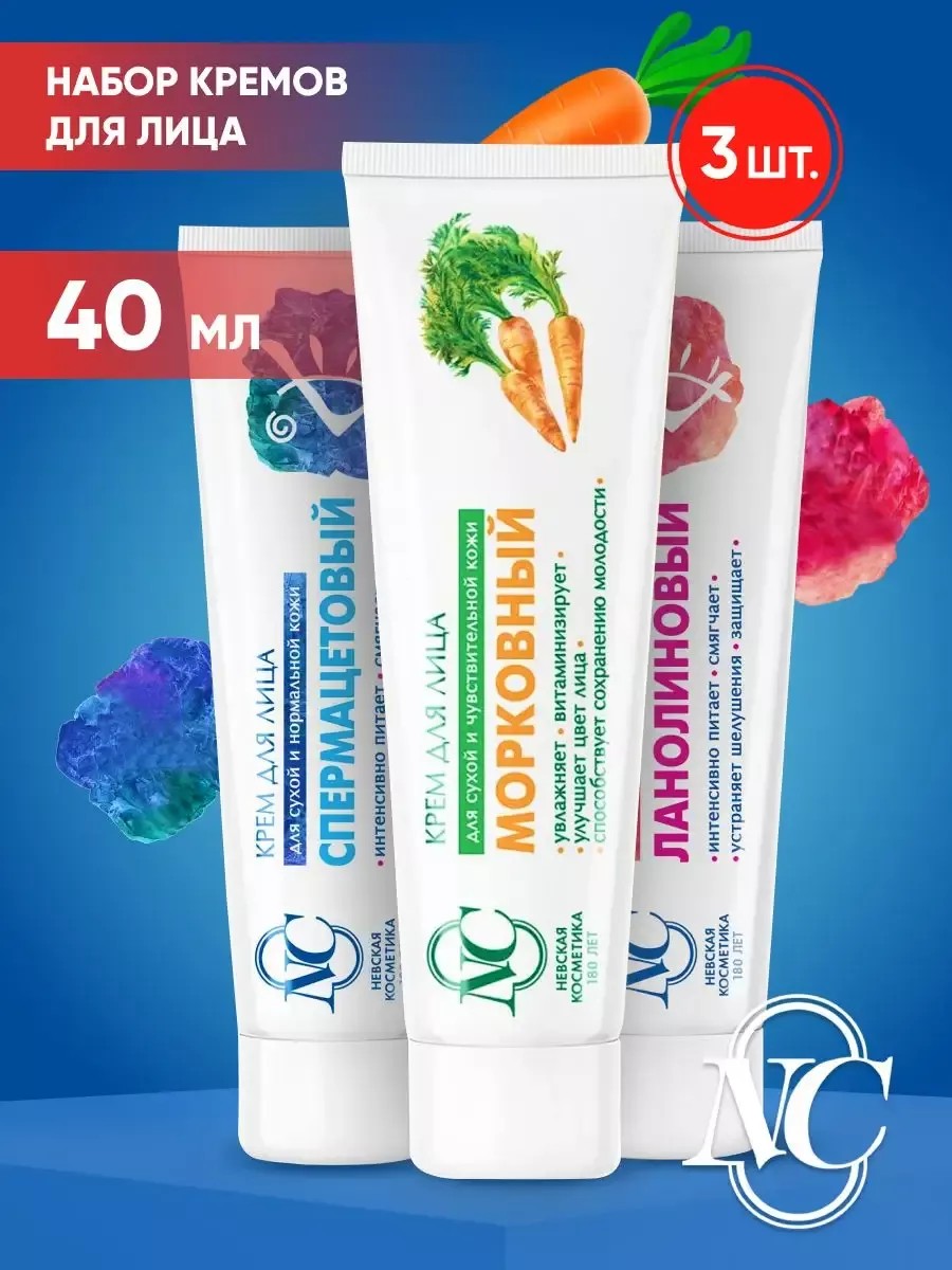 Набор кремов для лица Невская Косметика 3 шт., 40 мл состоит из спермацетового, морковного средства и продукта с ланолином. Уходовую женскую формулу производят без химической отдушки, сульфатов и парабена. Для достижения результата нанесите немного продукта круговыми движениями в области декольте и шеи на чистую кожу. Профессиональные крема участвуют в восстановлении поврежденного эпидермиса. Продукт подходит для всех видов эпидермиса: комбинированной, сухой и сверхчувствительной эпидермы. Натуральные гипоаллергенные компоненты витаминизируют дерму, оказывают интенсивное питательное воздействие и увлажнение Косметический органический продукт из России с омолаживающим эффектом подходит для ежедневного использования, нанесения в дневное и ночное время. Линия для ухода за эпидермой поможет девушкам продлить красоту и молодость эпидермиса, восстановит и усилит защиту от ранних изменений зрелой эпидермы женщин 30 + лет, запуская процесс самоомоложения. Спермацетовый продукт имеет увлажняющее воздействие. Минеральное и оливковое масла имеют увлажняющее свойство, усиливают защитные механизмы эпидермиса, ускорят его регенерирующее воздействие. Компоненты предохраняют кожные клетки от обезвоживания и сухости. Ланолин возвращает утраченную упругость, активирует лифтинг-эффект. Пчелиный воск усиливает противовоспалительные свойства, воздействует на чувствительную дерму убирая следы раздражения и покраснений. Ланолиновый продукт эффективен против шелушения, витамин А ускорит обмен веществ внутри клеток. Ретинол помогает в маскировке гиперпигментации и выравнивании овала и контура кожных покровов. Олива известна интенсивными увлажняющим эффектом. Набор станет отличным подарком для мамы и бабушки, активные вещества замедлят антивозрастной процесс. Универсальная формула с экстрактом моркови эффективна в разглаживании морщин и предотвратит увядание эпидермиса, активирует создание эластиновых и коллагеновых волокон, которые отвечают за возрастные действия.