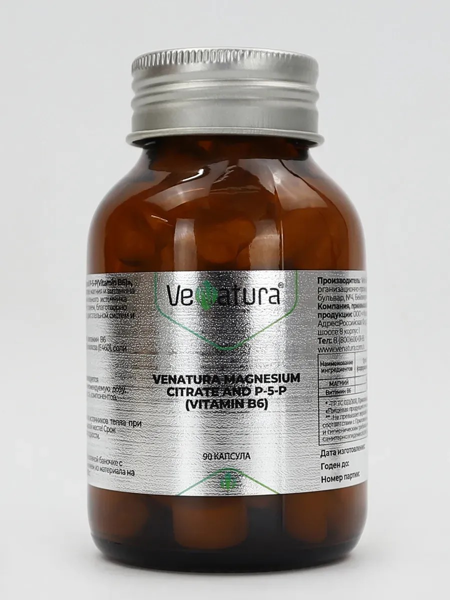 VeNatura Magnesium citrate and P-5-P (Vitamin B6) capsules / VeNatura Magnesium Citrate and P-5-P (Vitamin B6) are recommended as an additional source of magnesium and vitamin B6, have a general strengthening effect, have a beneficial effect on the functioning of the nervous, cardiovascular, musculoskeletal systems and gastrointestinal tract.