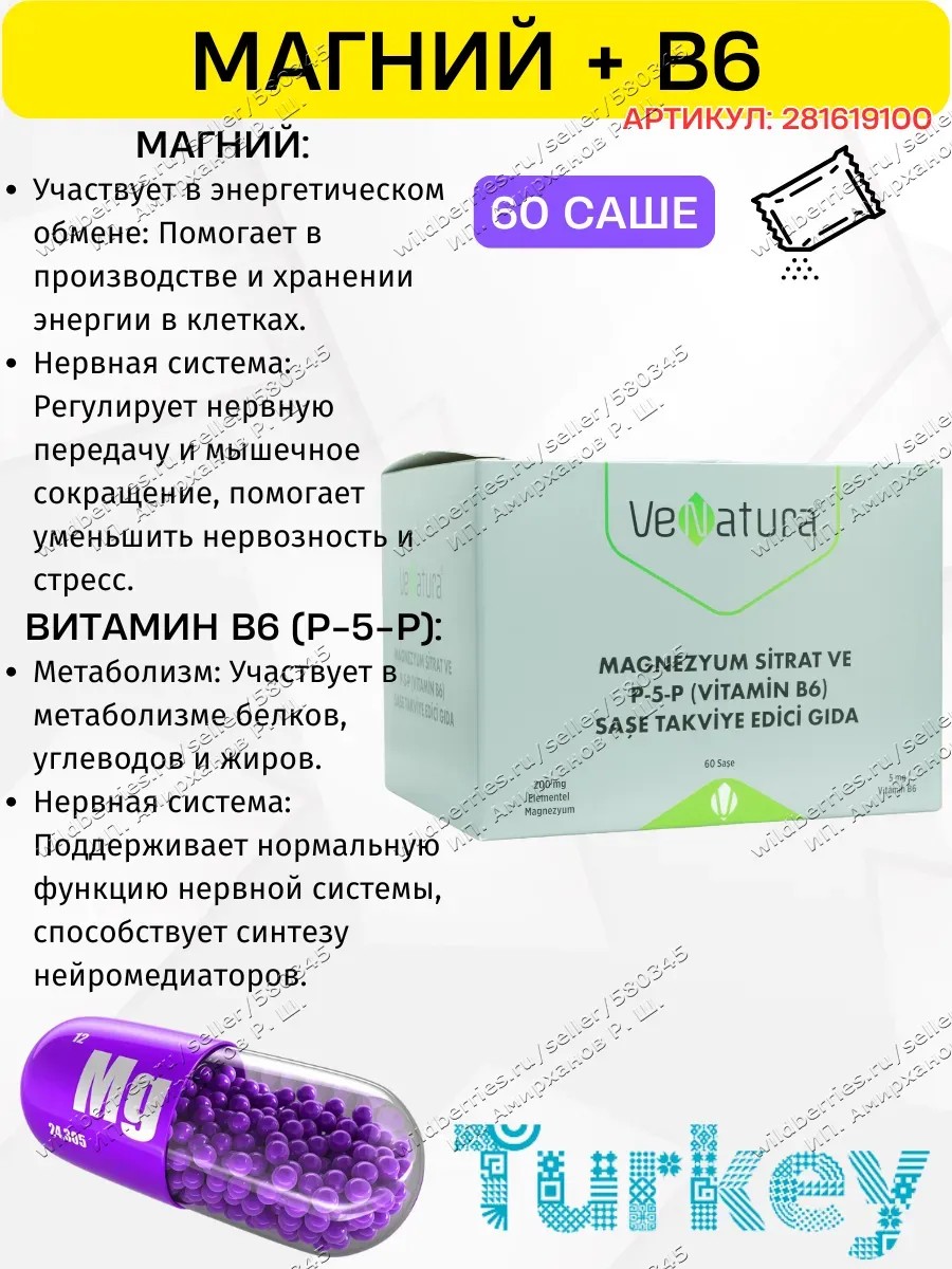 | Комплектация | картонная коробка; 60 саше-пакетиков с Магния Цитрат и Витамином Б6 Venatura |