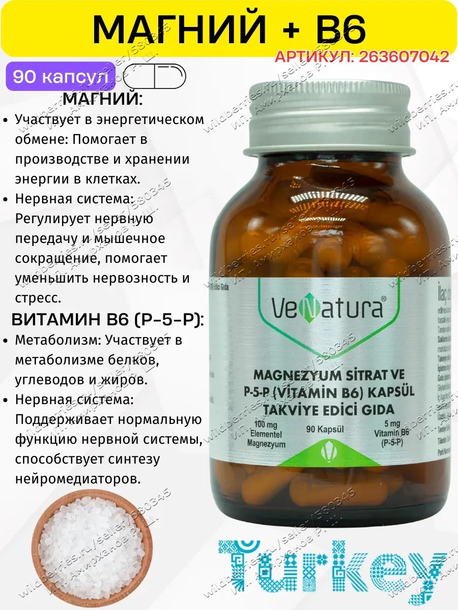 | Комплектация | Стеклянная баночка (с железной крышкой); вся баночка обернута в защитную слюду; мембрана под крышкой; 90 капсул с цитратом магния и витамином Б6 Турция Venatura |