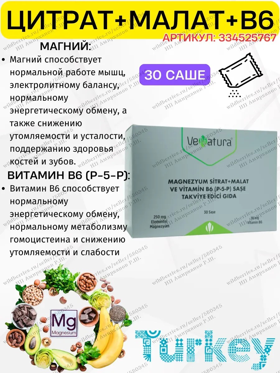 | Комплектация | картонная коробка; 30 саше-пакетиков с Магния Цитрат Малат и Витамином Б6 Venatura |
