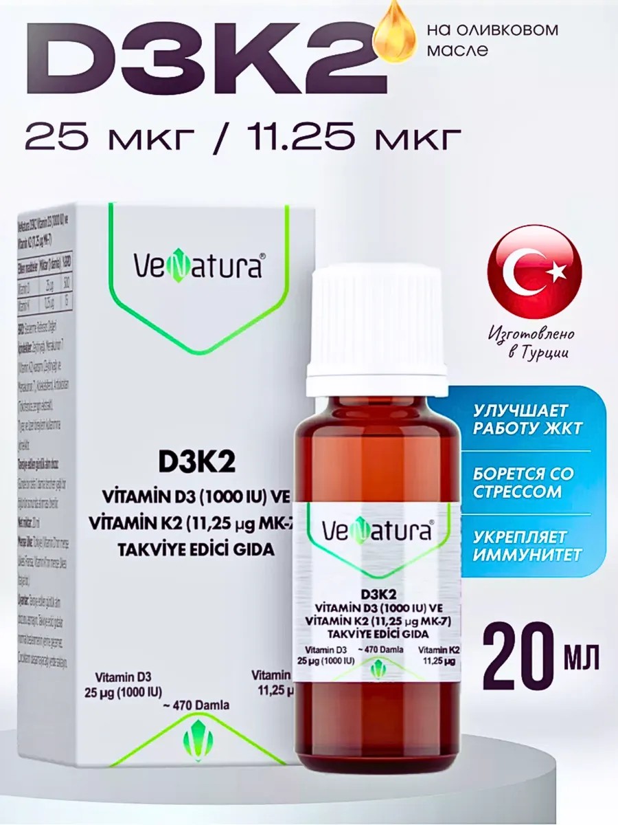 Витамин D3 с K2 и маслом оливы 20мл venatura из Турции