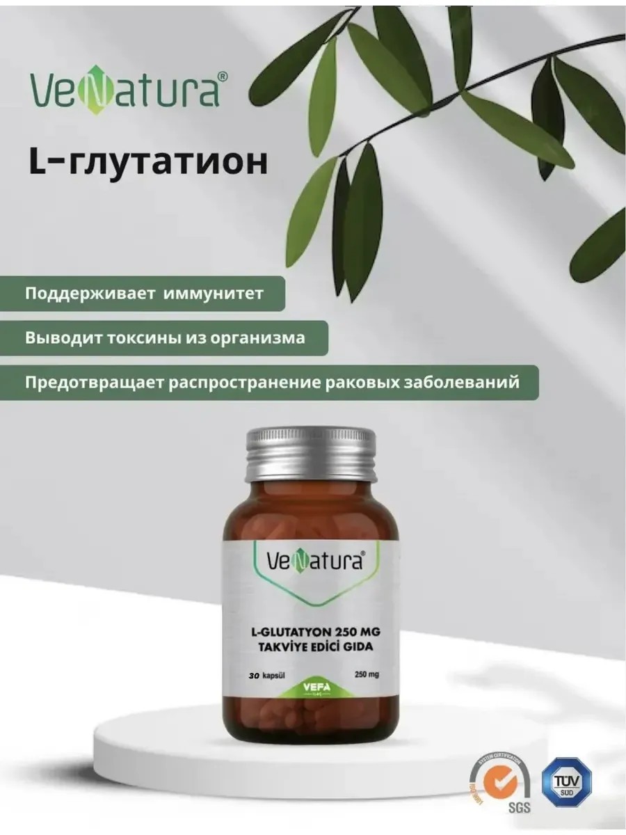 VeNatura L-Glutathione 250 mg 30 capsules is a high-quality supplement containing glutathione (Setria), a powerful antioxidant that supports liver and body detoxification processes, strengthens the immune system, reduces chronic inflammation, prevents the spread of cancer, and helps remove toxins from the body.