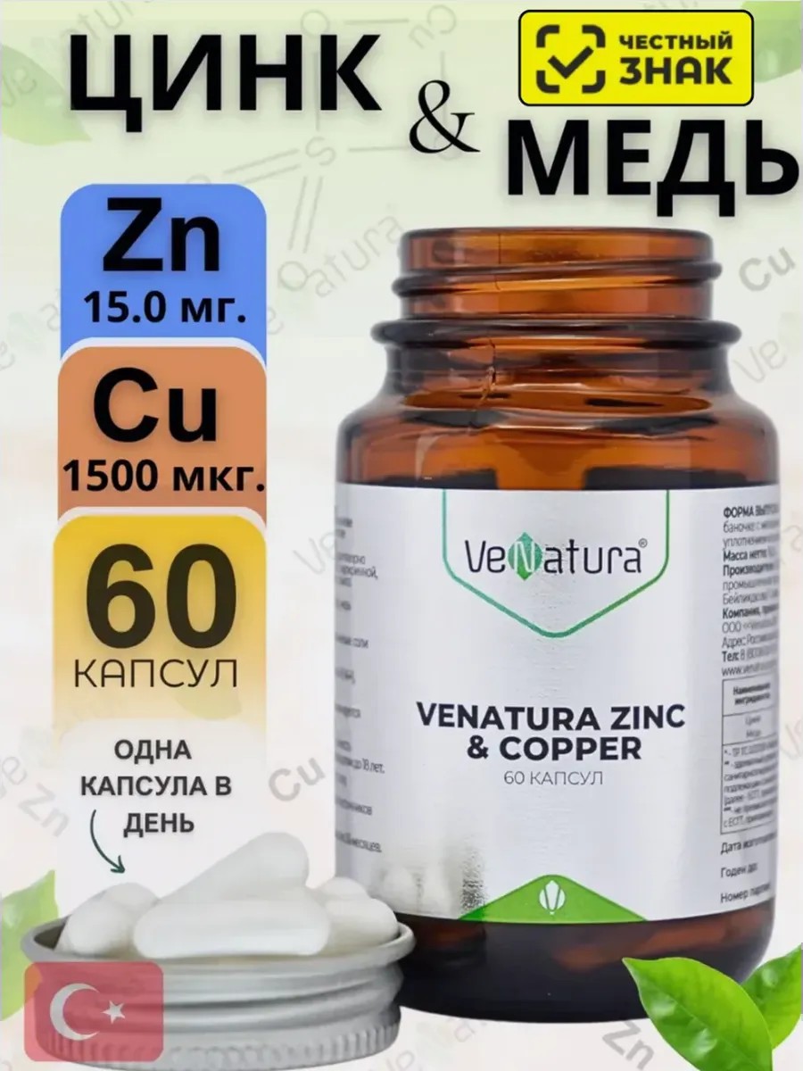 Капсулы VeNatura Zinc & Copper / ВеНатура Цинк и Медь рекомендуются в качестве дополнительного источника цинк и меди, обладают общеукрепляющим и антиоксидантным действием, благотворно влияют на работу сердечно-сосудистой, мочеполовой, эндокринной, скелетно-мышечной, систем и желудочно-кишечного тракта.
