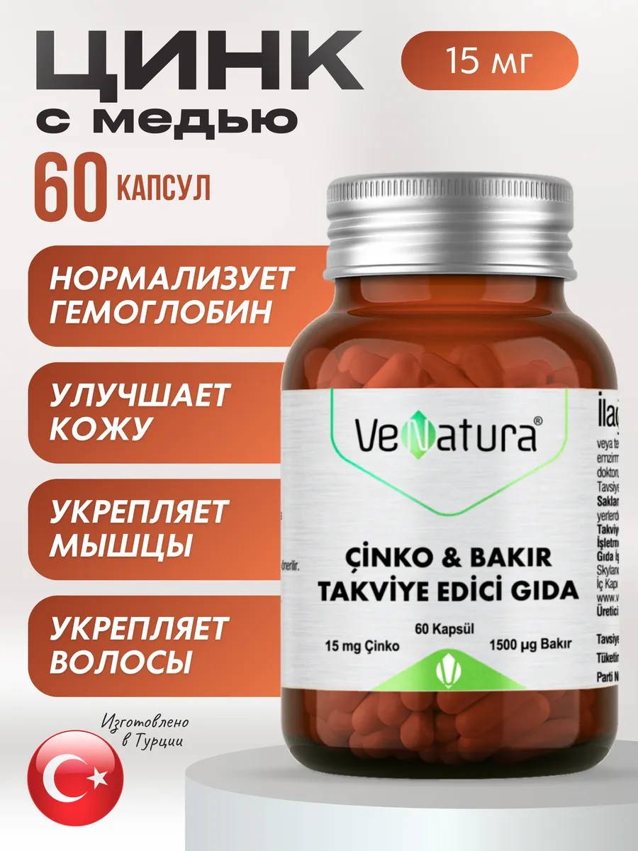 Пиколинат цинка с медью от турецкого бренда Venatura — это идеальное решение для тех, кто заботится о своем здоровье и хочет чувствовать себя прекрасно каждый день. Данная форма витамина обладает высокой биодоступностью, поэтому организм усваивает его легче и быстрее. Играет ключевую роль в поддержании иммунной функции, способствует заживлению ран и улучшает состояние кожи. Для взрослых и детей страше 11 лет рекомендуется принимать по одной капсуле в день во время еды, запивая достаточным количеством воды. Это поможет вам максимально эффективно усваивать все полезные вещества. Преимущества приема: укрепление иммунной системы, помогает организму бороться с инфекциями и вирусами; ускоряет образование коллагена; ослабляет симптомы аллергических реакций; способствует улучшению состояния кожи, при акне и других дерматологических проблемах; поддержка здоровья волос, предотвращая их выпадение и способствуя росту; медь является мощным антиоксидантом, который помогает защищать клетки организма от повреждений. Позаботьтесь о себе и своих близких — выберите качество и эффективность от проверенного бренда!