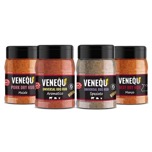The VENEQU BBQ GOURMET PACK 3 contains four different 150g packs of mixed spices and herbs for barbecue, made with high-quality, natural ingredients, and free of MSG, anti-caking agents, and preservatives. Inside this fantastic Multi Pack, you'll find two Dry Rubs specifically formulated for pork and chicken, ideal for slow, low-temperature cooking (Low Slow method), and two universal Dry Rubs also suitable for high-temperature grilling with quick cooking times (Hot Fast method). Each variety contains several expertly blended ingredients to deliver the right levels of flavor and enhance the taste in different preparations. Instructions for use: Apply the VENEQU Dry Rub to the meat and rub vigorously on both sides. Before cooking, marinate for 15 minutes to several hours, depending on the size of the cut. To prevent the sugars in the seasoning from burning, be sure to lightly spray the grill with oil before cooking. Also ideal for enjoying grilled potatoes and vegetables. INGREDIENTS Pork Dry Rub: salt, brown sugar, paprika, black pepper, coriander, cumin, fennel, chili pepper, rosemary, garlic (may contain traces of sulfites). BEEF Dry Rub: salt, brown sugar, paprika, black pepper, rosemary, coriander, onion, green pepper, juniper, cardamom, chili pepper, mustard, cumin, oregano, cloves, chili pepper, marjoram, dragon's clove. INSTRUCTIONS Apply the Venequ Dry Rub to the meat and then rub vigorously on both sides. Before cooking, marinate for 15 minutes to several hours depending on the size of the cut. To prevent the sugars in the seasoning from burning, be sure to lightly spray the grill with oil before cooking. See moreVENEQU BBQ DRY RUBs Gourmet Set 3 (150 g x 4 RUBs) Made in Italy 1 x Pork Rub, 1 x bœuf Rub, 1 Rub aromatique et 1 Rub épicé 4 x 150 g Gourmet Set 3DESCRIPTION DU PRODUIT DESCRIPTION DU PRODUIT Le VENEQU BBQ GOURMET PACK 3 contient 4 paquets différents de 150 g de mélange d'épices et d'herbes pour barbecue à base d'éléments naturels de haute qualité, sans glutamate, sans agents anti-agglomérants ou conservateurs. À l'intérieur de ce fantastique Multi Pack vous trouverez 2 Dry Rub spécifiques pour le porc et le poulet, idéales pour les cuissons prolongées et à basse température (méthode Low Slow), et 2 Dry Rub universels adaptés également pour les grillages à haute température et avec des temps rapides (méthode Hot Fast). Chaque variante contient plusieurs ingrédients savamment mélangés pour offrir les bons niveaux de saveur et d'exaltation des goûts dans les différentes préparations. Mode d'utilisation : appliquer sur la viande le VENEQU Dry Rub puis frotter énergiquement à sec des deux côtés. Avant d'aller en cuisson, vous avez besoin de 15 minutes de marinade jusqu'à plusieurs heures selon la taille de la pièce. Pour éviter que les sucres présents dans l'assaisonnement ne puissent brûler, assurez-vous de vaporiser un peu d'huile sur la grille avant la cuisson. Idéal également pour savourer les pommes de terre et les légumes grillés. INGRÉDIENTS Pork Dry Rub: sel, sucre brun, paprica, poivre noir, coriandre, cumin, fenouil, piment, romarin, ail (peut contenir des traces de sulfites). BEEF Dry Rub: sel, sucre brun, papriche, poivre noir, romarin, coriandre, oignon, poivre vert, genévrier, cardamome, piment, moutarde, cumin, origan, clou de girofle, piment, marjolaine, dragoncelle. MODE D'EMPLOI Appliquer sur la viande le Venequ Dry Rub puis frotter énergiquement à sec des deux côtés. Avant d'aller en cuisson, vous avez besoin de 15 minutes de marinade jusqu'à plusieurs heures selon la taille de la pièce. Pour éviter que les sucres présents dans l'assaisonnement ne puissent brûler, assurez-vous de vaporiser un peu d'huile sur la grille avant la cuisson. Voir plus