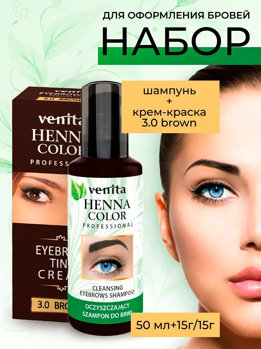 The eyebrow set includes a 15g/15g brown cream tint and a 50ml eyebrow cleansing shampoo. 1. The cream tint is a modern formula of a well-known cosmetic product. Contains henna extract. Its convenient application makes it incredibly easy to highlight the natural beauty of your brows. Before use, perform a skin sensitivity test. Protect the skin around your brows with a rich cream. Mix 8-10 drops of activator with the tinting cream (approximately 1 cm) in a glass container and apply to your brows using a precision double-ended applicator. Leave on for 5 to 10 minutes, depending on the desired degree of tinting. Finally, rinse your brows with warm water and soap. Use the mixture immediately. This tint is intended for eyebrow tinting only. Avoid contact with eyes and wear protective gloves. 2. Henna Color Brow Cleansing Shampoo gently removes impurities and makeup, opens hair cuticles, and degreases the skin. Use before tinting with dye or henna, for long-lasting eyebrow styling, and for daily home care. Suitable for all types of dyes and henna, it prolongs the color's durability. Directions: Apply a small amount of shampoo to eyebrows, massage, then remove with a damp cotton pad.
