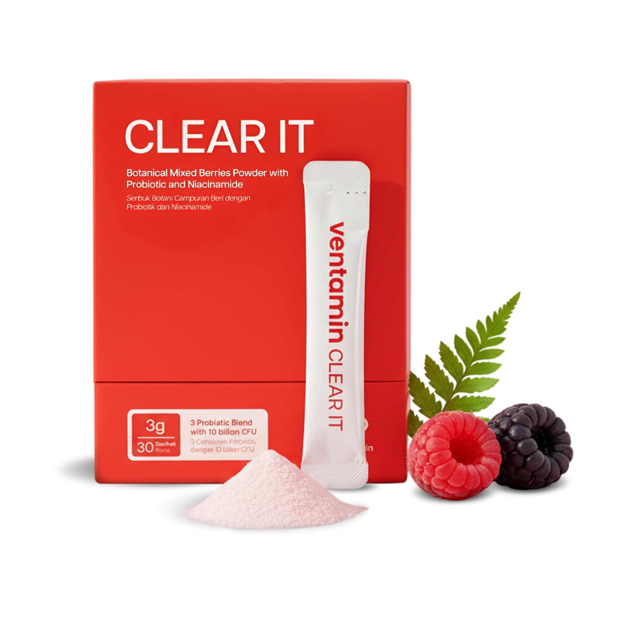 Suitable for teenagers and adults dealing with acne, whiteheads, blackheads and oily skin. Suitable for teenagers and adults dealing with acne, whiteheads, blackheads and oily skin. Comprehensive Care: Mix and match with VENTAMIN Clear It supplement for a well-rounded approach to your skin and overall wellness. Easy and Delicious: Drink ONE berry flavored sachet, mix with 200ml of water. Gluten-free, with no artificial colors or flavors. Key Ingredients: Featuring vitamins A and B complex to fight free radicals, zinc and probiotics for healthy skin tissue generation, and magnesium, niacin (B3), and selenium for detoxification. Clear It Sachet: Ventamin's powder supplements are packed with detoxifying antioxidants, vitamins, and minerals that support a clear and radiant complexion from within.