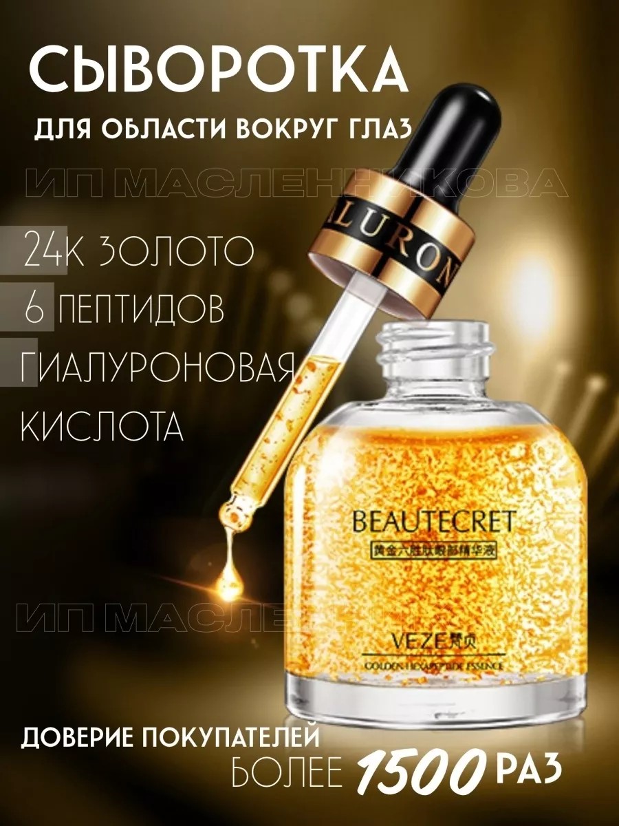 Шелковистая сыворотка с гиалуроновой кислотой насыщена множеством частиц 24-каратного золота, которые бережно и глубоко ухаживают за нежной кожей вокруг глаз. Благодаря уникальной формуле, средство выполняет мощную питательную и увлажняющую функцию, предотвращает появление морщин и уменьшает выраженность мешков под глазами. Шесть пептидов, которые являются мощным омолаживающим миорелаксантом, способствуют повышенной выработке коллагена и эластина: мимические заломы менее выражены, морщины разглажены, тусклый цвет кожи и тёмные круги - больше не проблема. Гиалуроновая кислота, второй ключевой компонент, удерживает влагу в глубинных слоях эпидермиса, устраняя обезвоженность, и обеспечивая упругость и здоровое сияние. Сыворотка быстро впитывается, не оставляет ощущения липкости, а 24-каратное золото, природный минерал, омолаживает и выравнивает цвет. Средство предназначено для зоны вокруг глаз, но подойдёт и для комплексного ухода за кожей лица. Полезный подарок на новый год и на день рождения.