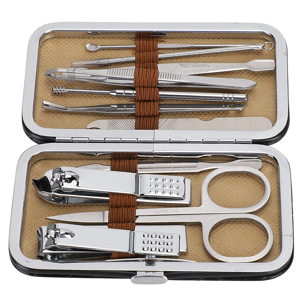 Specification: Condition: 100% Brand New Item Type: Nail Clippers Set Material: Stainless Steel Quantity: 11pcs Optional Color: Khaki, Burgundy, Black Usage: Face care, hand care, foot care Package List: 1 x Flat Nail Clippers 1 x Eyebrow Scissors 1 x Oblique Nail Clippers 1 x Double Pick 1 x Eyebrow Clip 1 x Dead Skin Remover 1 x Nail File 1 x Spiral Earwax Spoon 1 x Knife 1 x Acne Needle 1 x Earwax Spoon