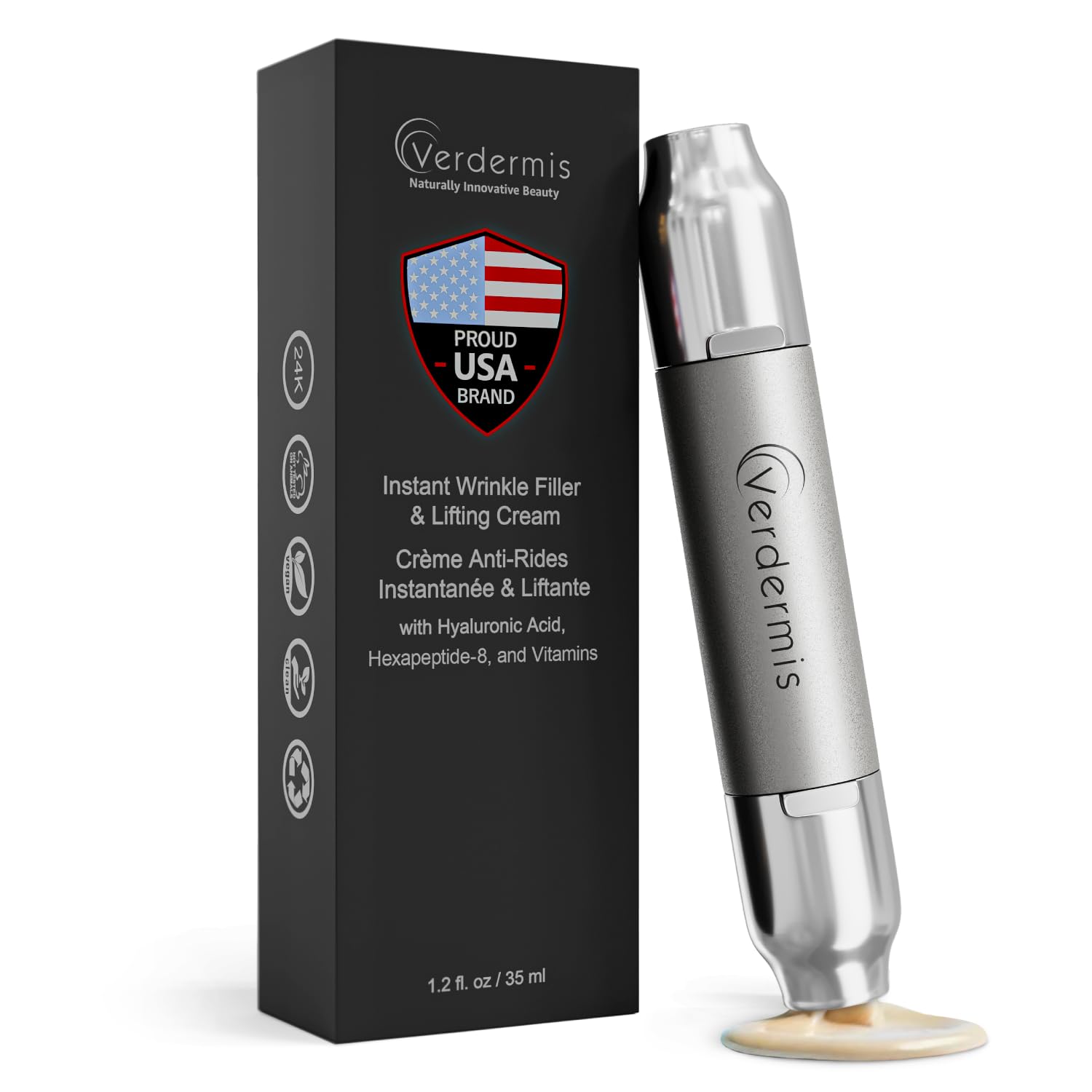 NOT TESTED ON ANIMALS. CRUELTY FREE. VEGAN. PARABEN FREE. NO FILLERS. NO HARMFUL FRAGRANCES. FOR MEN AND WOMEN. XL SIZE 1.2 OZ. EASY TO APPLY ON TARGETED AREAS OF CONCERN: Verdermis non-invasive Instant Wrinkle Filler Lifting Cream, in an exclusive no-needle applicator for an accurate dosage and application over areas of concern, injects powerful anti-aging ingredients onto the skin for Instant Facelift and wrinkle filling effects. HIGH-PERFORMANCE POTENT INGREDIENTS: Enriched with Hyaluronic Acid, potent Peptides, and anti-oxidant Vitamins – all known for their beautifying properties – this Instant Wrinkle Filler Lifting Cream battles the visible signs of the aging process such as wrinkles, fine-lines, and sagging skin for a revitalized, youthful appearance. RESULTS, RESULTS, RESULTS: A potent and powerful formula that within minutes after application tones, tightens, and contours the skin to generate a noticeable facelift effect by smoothing out and filling fine-lines and wrinkles. This advanced Wrinkle Filler Lifting Cream improves skin's firmness, texture, and elasticity for a flawless appearance. INSTANT FACELIFT ANYONE? Enjoy noticeable improvements in the way your skin looks and feels within minutes after application. This revolutionary formula battles the visible signs of premature aging such as wrinkles, fine-lines, and sagging skin. An advanced applicator for targeted application over areas of concern. XL Size 1.2 Oz. For all Skin Types. Join the hottest trend in BEAUTY and enjoy the same skin care that is being praised by celebrities, top models, and movie stars.