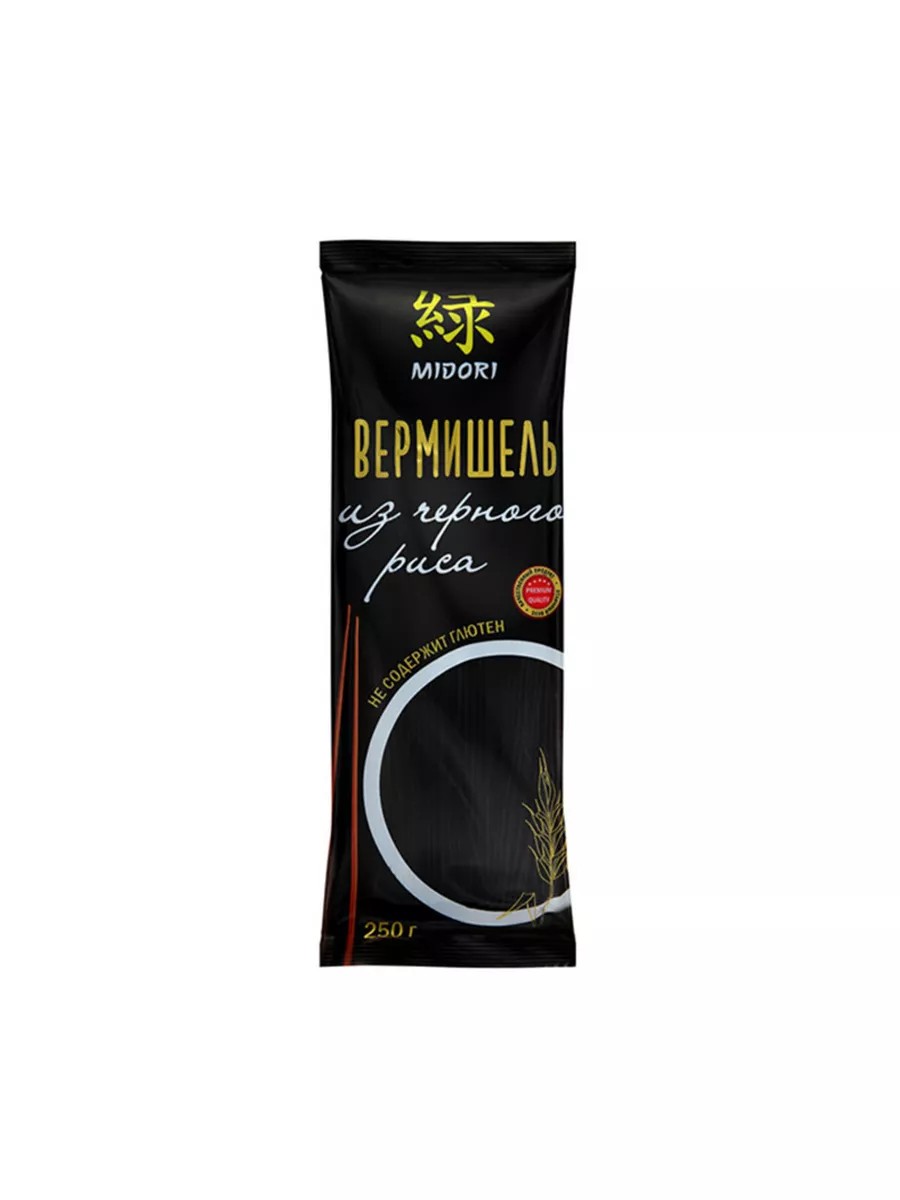 Midori Black Rice Vermicelli, 250g. Midori black rice vermicelli contains a huge amount of protein, minerals, and vitamins B and E. These noodles are the perfect complement to a variety of Asian and European dishes. Ingredients: black rice flour, white rice flour, drinking water. Nutritional value per 100g: 340 kcal, protein 10g, fat 1.1g, carbohydrates 72.4g. Shelf life: 36 months.
