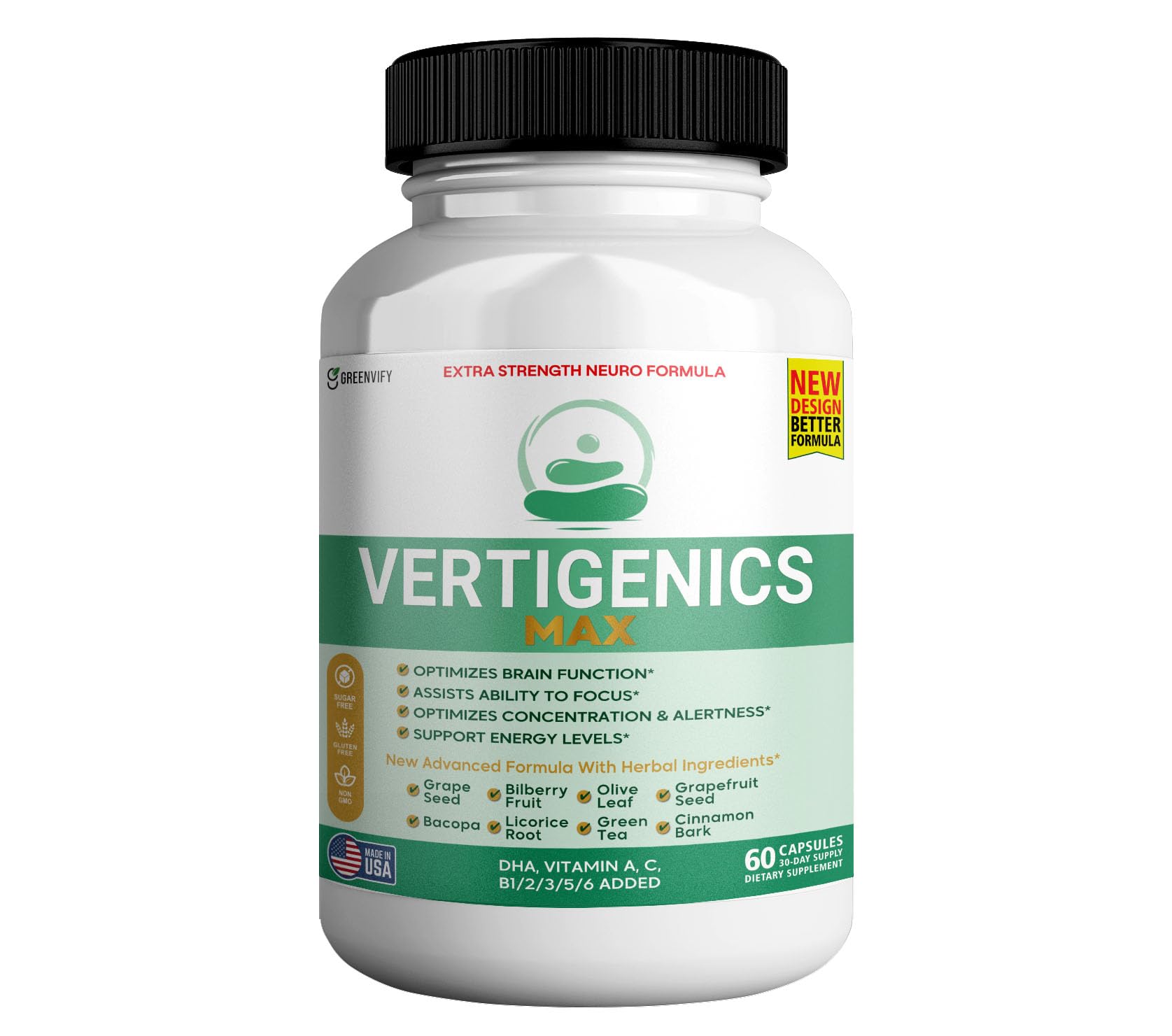 Vertigenics Max by GreenVify is a premium extra strength neuro formula crafted to support optimal brain health, focus, and mental energy. Whether you're tackling a demanding workday or studying for exams, this advanced supplement helps unlock your mental potential. Each serving delivers a full spectrum of essential vitamins including Vitamin A, C, D, E, and B-Complex, alongside vital minerals like Zinc, Magnesium, and Iron. The proprietary blend includes time-tested nootropic ingredients such as Bacopa Monnieri, DMAE Bitartrate, GABA, Green Tea Extract, Bilberry Fruit, and Huperzine A. Key Benefits: Enhances focus, concentration alertness Supports memory, clarity, and cognitive performance Promotes healthy energy levels and brain metabolism Formulated with herbal and nutritional ingredients known to nourish the brain Free from gluten, sugar, soy, and GMOs. Manufactured in the USA under GMP standards. These statements have not been evaluated by the Food and Drug Administration. This product is not intended to diagnose, treat, cure, or prevent any disease.✓ Clean Trusted Formula – Gluten-free, sugar-free, non-GMO, and made in a GMP-certified facility in the USA. No soy or fish allergens. Complete Neuro Nutrient Matrix – Includes Vitamin A, C, D, E, B1, B2, B3, B5, B6, Biotin, Zinc, Magnesium, DHA, and more—backed by a 609 mg proprietary herbal nootropic blend. Neuro Support Herbal Blend – Features brain-nourishing ingredients like Bacopa, Green Tea, Grape Seed, Licorice Root, Cinnamon Bark, and more for holistic mental wellness. ? Energy Alertness Booster – Helps support energy levels and optimize alertness with key nutrients including B-Vitamins, Vitamin C, and Magnesium. Supports Brain Function Mental Clarity – Designed to enhance focus, concentration, memory, and overall cognitive performance with a powerful blend of vitamins, minerals, and herbal extracts.