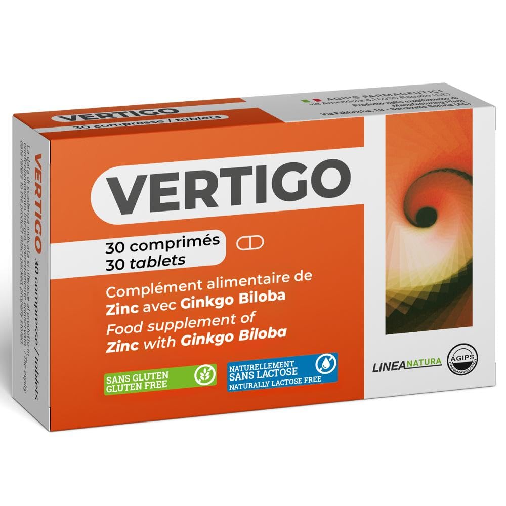 WHY CHOOSE VERTIGO? Agips Pharmaceuticals is synonymous with safety, distributed for years in the best pharmacies and medical practices. Ideal for adults. 100 Made in Italy, Vertigo is naturally lactose-free, gluten-free, and GMO-free. High concentration ginkgoflavonoids and Zinc with powerful antioxidant qualities. Zinc and Ginkgo Biloba 80mg extract titrated to 24 ginkgoflavonoids. Research on ginkgo focuses on its effects on memory, concentration, the brain, and blood circulation. Based on scientific literature Natural remedy to support the vascular functions of the hearing system (for tinnitus, vertigo, ringing in the ears).POURQUOI CHOISIR VERTIGO ? Agips pharmaceutiques est synonyme de sécurité, distribué depuis des années dans les meilleures pharmacies et cabinets médicaux. Idéal pour les adultes. 100 Made in Italy, Vertigo est naturellement sans lactose, sans gluten, sans OGM. Les ginkgoflavonoïdes à haute concentration et Zinc avec de puissantes qualités antioxydantes. Zinc et Ginkgo Biloba 80mg extrait titré à 24 en ginkgoflavonoïdes. La recherche sur le ginkgo se concentre sur ses effets sur la mémoire, la concentration, le cerveau et la circulation sanguine. Fondé sur la littérature scientifique Remède naturel pour soutenir les fonctions vasculaires de l'appareil auditif (pour les acouphènes, les vertiges, le bourdonnement d'oreille).
