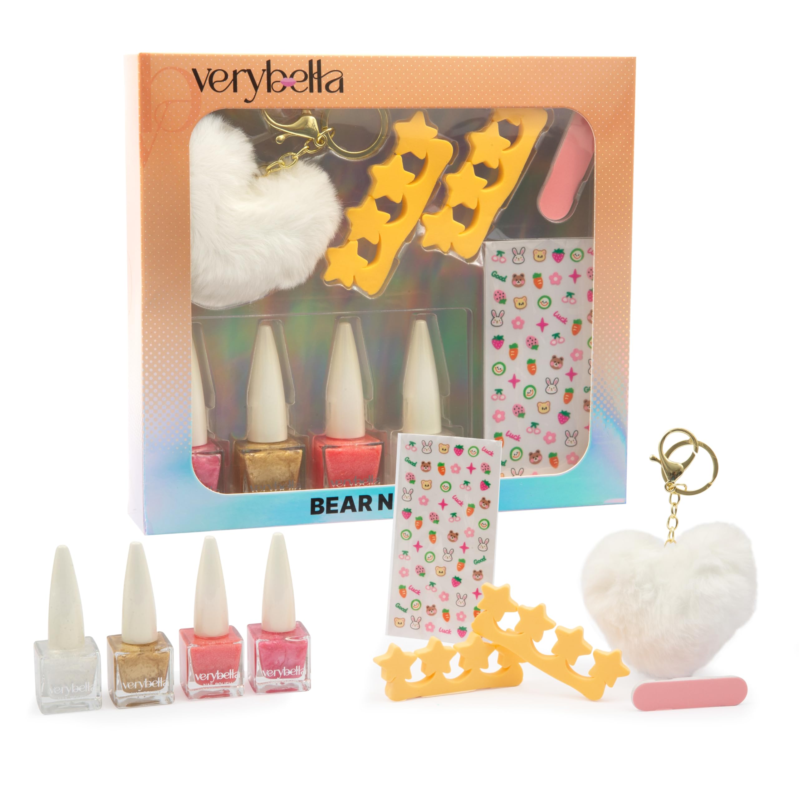 verybella The Bear set for the perfect manicure contains: 4 colored Peel Off nail polishes 1 nail file 2 soft colored nail stickers 1 heart-shaped keychain.
