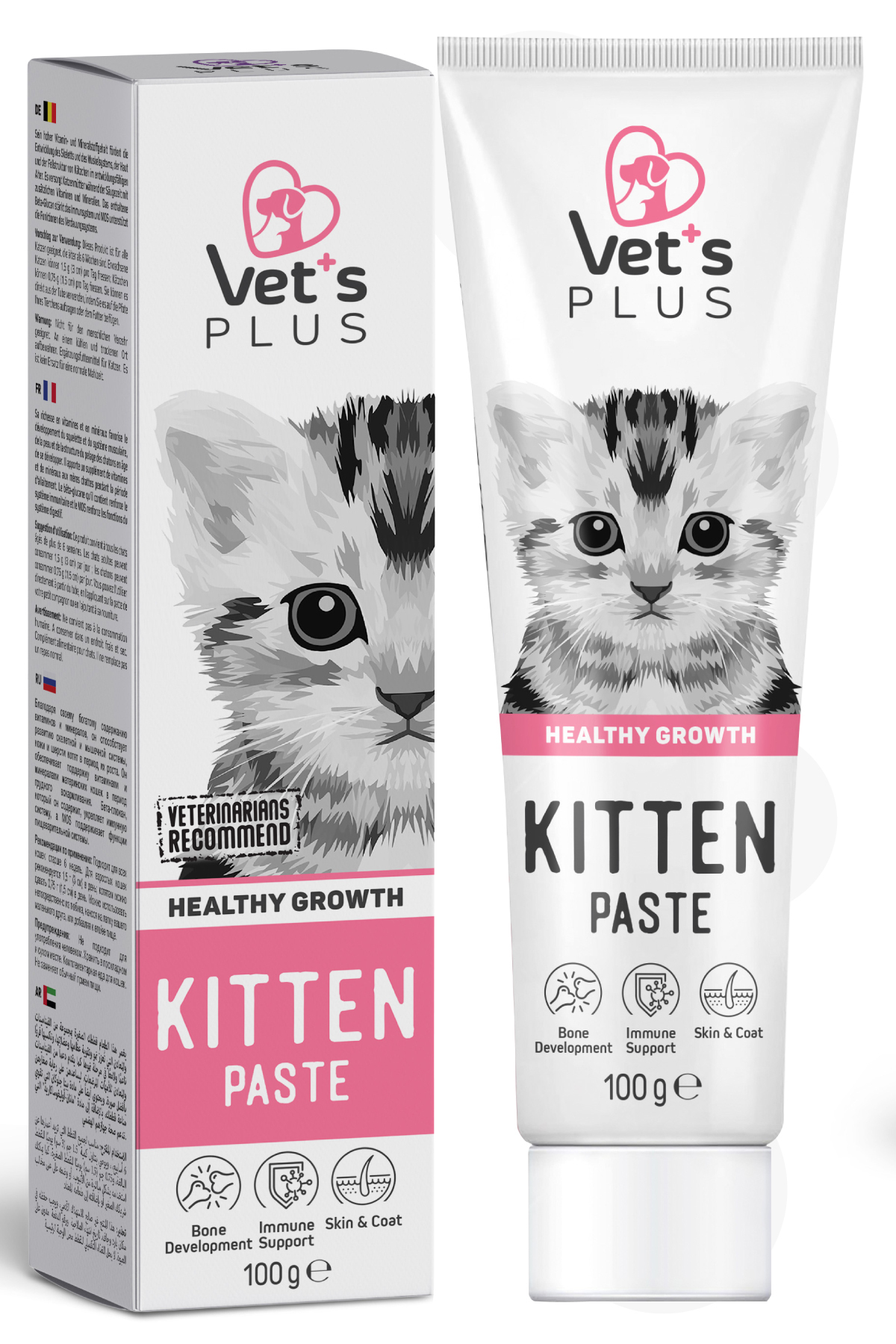 Vet's Plus Premium Kalsiyumlu Hamile ve Yavru Kedi Vitamin Macunu, içerdigi taurin ile kalp ve göz fonksiyonlarini destekler.