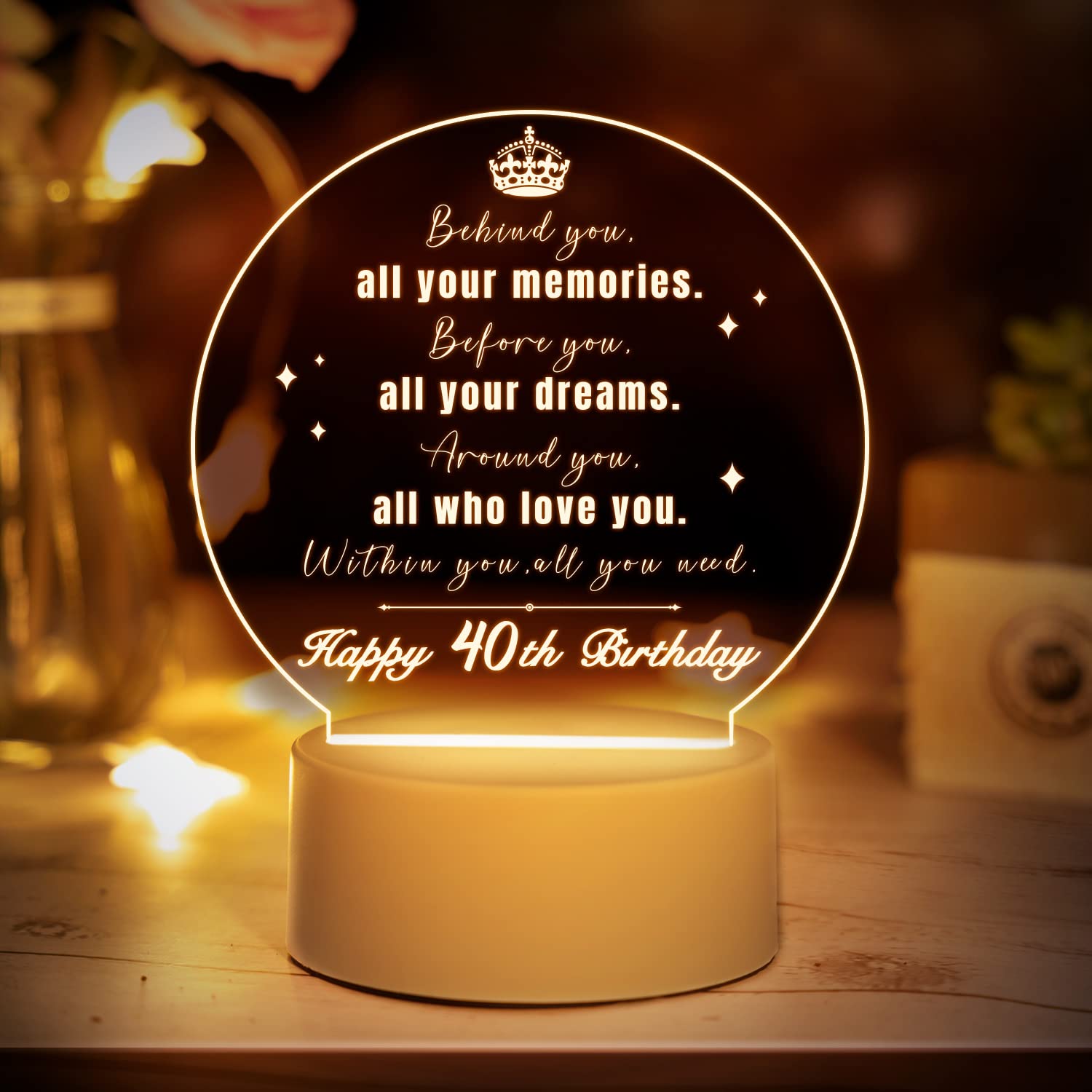 ?Better After-Sales Service? We are confident in our products. The night light for men and women is a birthday gift. If you have any problems, you can send us an email at any time, and we will solve the problem for you. ?Round-shaped Energy Efficiency Night Light? This round-shaped lamp with USB charge consumes low power, which helps save electricity bills and protect the environment. And our LED night light is made of acrylic material, which is firm and unbreakable. The size of the acrylic is 5.5 x 5.0 inches. The size of the base is 3.8 x 3.8 inches. This gift will make your friends, sweetheart, and family happy every day. ?Sweet Birthday Decor? This night light is a perfect addition for bedroom. The LED lamps in the base have bright warm white light, which is also very soft and will not irritate the eyes even when you wakes up in the early morning. You will like this night light's company. This night light 40 birthday gifts with soft light that makes you more cosy to sleep at night. ?40 Years Old Birthday Gifts Idea for Every Occasion? On every special day, the birthday lamp is cute gifts. The birthday night light is perfect as 40 birthday years old gifts for friends, grandma, grandad, father, mother, aunt, uncle, son, daughter, wife, husband, boyfriend, girlfriend, sister, brother, boss, coworker. ?Unique 40th Birthday Gifts? This gifts for those born in 1982 is lettering "Happy 40th birthday. Behind you, all your memories. Before you, all your dreams. Around you, all who love you. Within you,all you need." The night lamp cute 40th birthday gifts will bring you lucky and happiness. And the best friend gift can enhance the relationship.