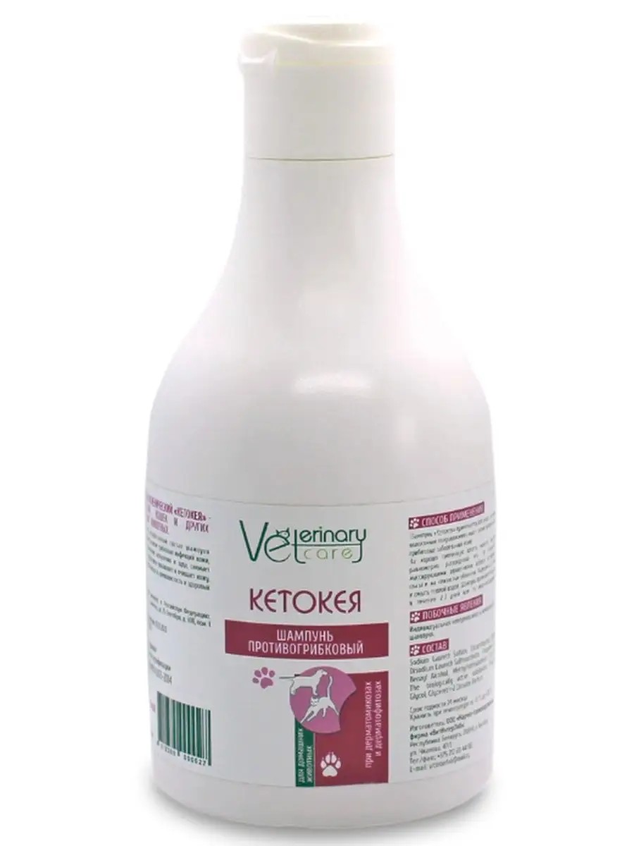 Ketokeya Antifungal Shampoo is a cleansing and hygienic product for dogs, cats, and other pets. It is used to care for the skin and hair of animals to prevent fungal skin diseases (ringworm and dermatophytosis). The shampoo's specially formulated formula prevents fungal skin infections, relieves flaking and itching, reduces inflammation, effectively moisturizes and cleanses the skin, and leaves the coat soft, silky, and shiny. Directions for use: Apply shampoo to thoroughly dampened fur, massaging it in, evenly distributing it over the surface, avoiding contact with eyes and mucous membranes. Leave on for 3-5 minutes, then rinse with warm water. Use daily for 3-7 days or as needed. Ingredients: Sodium Lauryl Sulfate, Cocamidopropyl Betaine, Disodium Salt, Sulfosuccinate, Propylene Glycol, Benzyl Alcohol, Methylchloroisothiazolinone, Citric Acid, Ketoconazole, Perfume.