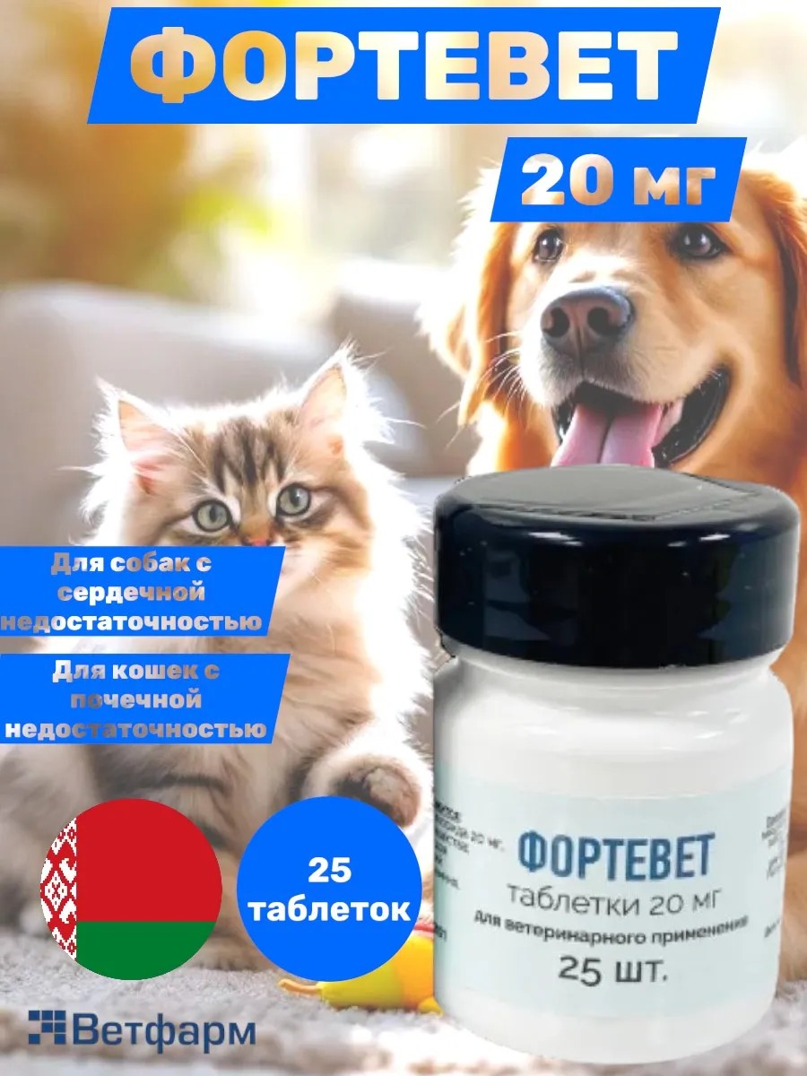 Fortevet 20 mg tablets for dogs and cats - 25 tablets are an effective way to maintain your pet's health. These Belarusian veterinary drugs, produced by Vetpharm, are a reliable analogue of such well-known medications as Fortecor, Vetmedin, and Avekardin.