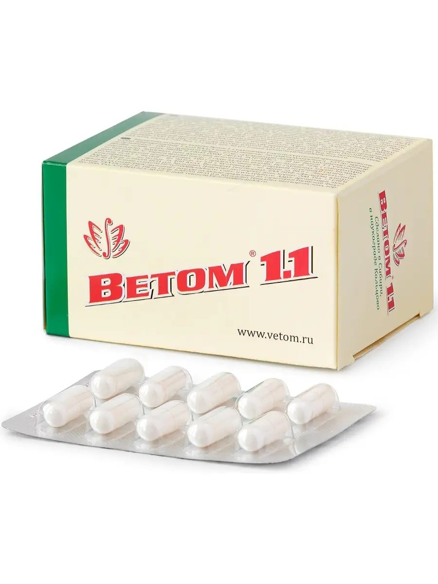 Ветом 1.1 для людей, 50 капсул - БАД пробиотик для нормализации микрофлоры и очистки ЖКТ. Оздоровительный эффект Ветом 1.1 обеспечивает свойствами бактерий Bacillus subtilis, которые, размножаясь преимущественно в толстом отделе кишечника, выделяют: протеолитические, амилолитические, целлюлозолитические ферменты; интерферон a-2 лейкоцитарный человеческий; бацитрацины, подавляющие рост и развитие патогенной и условно-патогенной микрофлоры; другие биологически активные вещества. Вследствие этого процесса микробный состав кишечника трансформируется до соответствующего эволюционно сложившейся норме, очищаются его стенки от неперевариваемых остатков пищи, что способствует активному выводу токсинов из организма, беспрепятственной доставке биологически активных и питательных веществ. Под воздействием Ветома 1.1 нормализуются: метаболизм, пищеварение и всасывание биологически активных компонентов пищи в желудочно-кишечном тракте. Область применения: Рекомендуется в качестве биологически активной добавки к пище как дополнительный источник пробиотических микроорганизмов для улучшения работы желудочно-кишечного тракта и восстановления микрофлоры кишечника. Способ применения: рекомендуется принимать в течение 10 дней по не менее 3-х раз в день по 1 капсуле во время или после приема пищи, запивая небольшим количеством воды, сока или чая. Состав: 1 доза БАД (1 капсула) содержит: экстракт кукурузный – 133 мг; крахмал картофельный – 100 мг; сахарная пудра – 67 мг; сухая культура пробиотических микроорганизмов Bacillus subtilis штамм ВКПМ В-10641 (DSM 24613), 1х10^9 КОЕ/г – 30 мг. Хранить при относительной влажности воздуха не выше 75% и температуре не выше 30°С. Беречь от детей. Производитель: ООО НПФ «Исследовательский центр», Новосибирск, наукоград Кольцово.