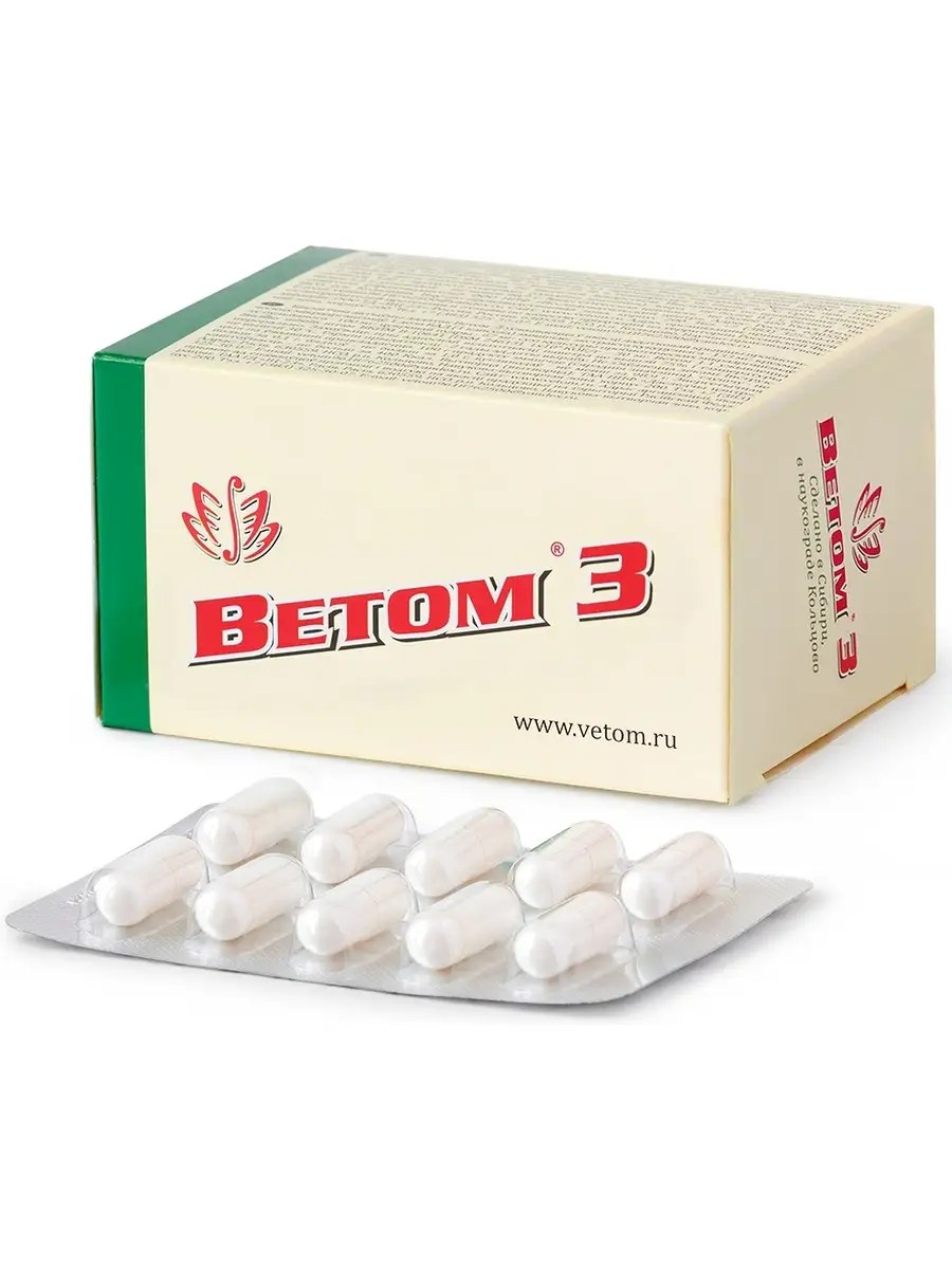 Ветом 3 для людей, 50 капсул - БАД пробиотик для нормализации микрофлоры и очистки ЖКТ. Оздоровительный эффект БАД Ветом 3 обеспечивается свойствами бактерий Bacillus amyloliquefaciens, которые, размножаясь преимущественно в толстом отделе кишечника, выделяют протеолитические, амилолитические, целлюлозолитические ферменты, биологически активные вещества, подавляющие рост и развитие патогенной и условно-патогенной микрофлоры. Вследствие этого процесса в кишечнике нормализуется микробный состав до соответствующего эволюционно сложившейся норме, очищаются его стенки от неперевариваемых остатков пищи, что способствует активному выводу токсинов из организма, беспрепятственной доставке биологически активных и питательных веществ. Под воздействием Ветома 3 нормализуются: метаболизм, пищеварение и всасывание биологически активных компонентов пищи в желудочно-кишечном тракте. Область применения: рекомендуется в качестве биологически активной добавки к пище как дополнительный источник пробиотических микроорганизмов для улучшения работы желудочно-кишечного тракта и восстановления микрофлоры кишечника. Способ применения: рекомендуется принимать в течение 10 дней по 3 раза в день по 1 капсуле во время или после приема пищи, запивая небольшим количеством воды, сока или чая. Состав: 1 доза БАД (1 капсула) содержит: экстракт кукурузный – 133 мг; крахмал картофельный – 100 мг; сахарная пудра – 67 мг; сухая культура пробиотических микроорганизмов Bacillus amyloliquefaciens штамм ВКПМ В-10642 (DSM 24614), 1х10^9 КОЕ/г – 30 мг. Производитель: ООО НПФ «Исследовательский центр», Новосибирск, наукоград Кольцово.