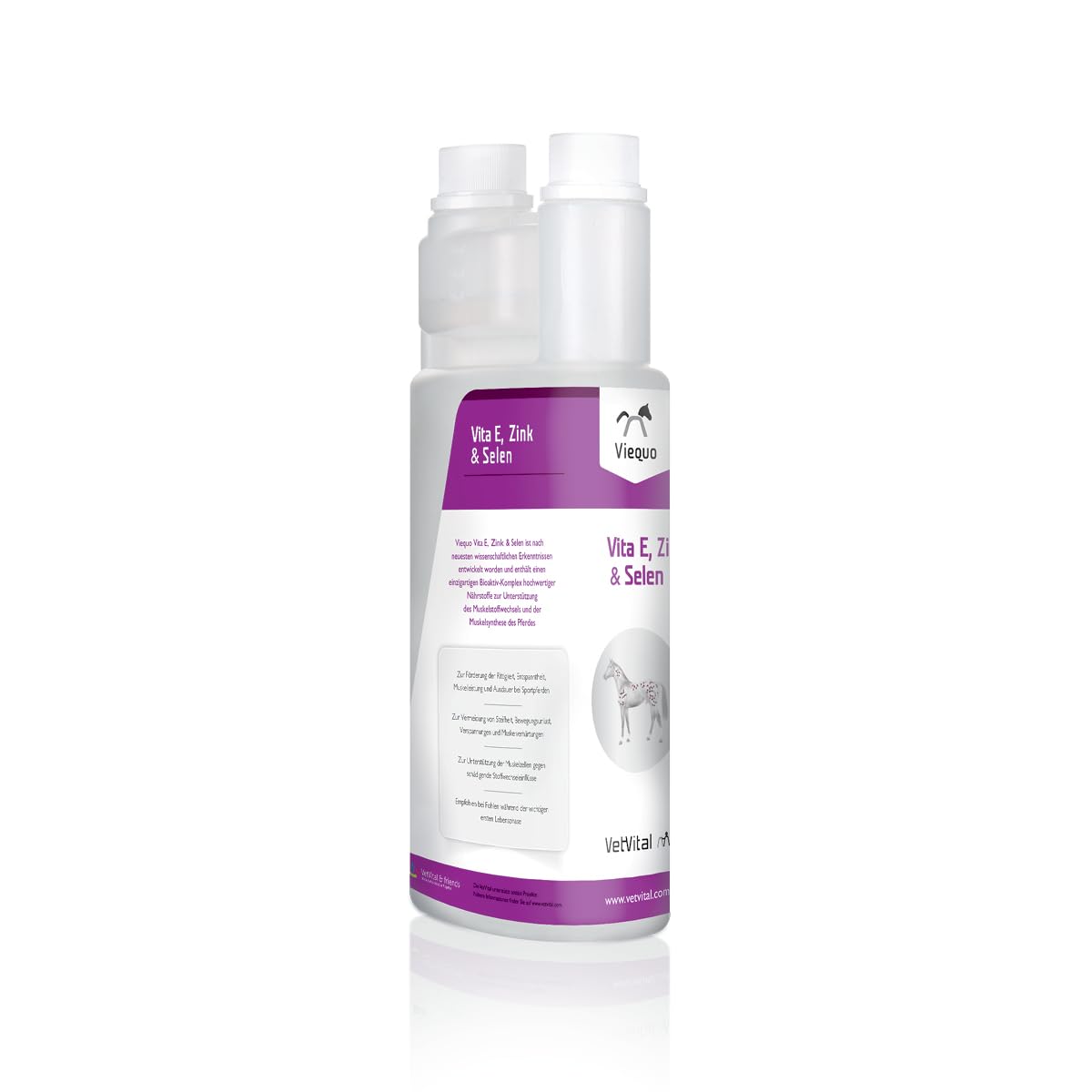Muscle stiffness and tension often cannot be resolved through training alone. Viequo Vita E, zinc and selenium was developed according to the latest scientific knowledge and contains a unique complex of high-quality nutrients. It can help promote chivalry, relaxation, muscular performance and endurance in sport horses. It serves to prevent stiffness, loss of movement, tension and muscle stiffness and can also be used for foals during the important first phase of life. Feeding advice: foals: 10 ml per animal and day, horses: 20 ml per animal and day, ideally 2 x 10 ml per day, horses under load: (after surgery, carrying and lactating mares, riding horses): 30 ml per animal and day, ideally 2 x 15 ml per day Shake before use! INGREDIENTS COMPOSITION: 1,2-propanediol, sorbitol, sodium citrate, sodium chloride, potassium chloride DIRECTIONS FOR USE Feeding advice: foals: 10 ml per animal and day, horses: 20 ml per animal and day, ideally 2 x 10 ml per day, horses under load: (after surgery, carrying and lactating mares, riding horses): 30 ml per animal and day, ideally 2 x 15 ml per day ✓ ZINK – A true all-rounder – Zinc is involved in a variety of reactions in the body, e.g., cell growth, wound healing, and various metabolic processes. Vitamin E: Vitamin E is a cell-protecting vitamin and can help protect the body's cells from harmful influences, e.g., aggressive oxygen compounds. Important nutrients: Viequo Vita E, Zinc Selenium was developed according to the latest scientific findings and contains a unique complex of high-quality nutrients. ✓ Muscle retention – Since muscle stiffness and tension cannot always be resolved through training, VetVital Viequo Vita E, Zinc Selenium can help prevent them. Supplementary feed: It is suitable for promoting chivalry, relaxation, muscle performance, and endurance in sport horses and during the important first phase of life in foals. Les raideurs musculaires et les tensions ne peuvent souvent pas être résolues uniquement par l'entraînement. Viequo Vita E, zinc et sélénium a été développé selon les dernières connaissances scientifiques et contient un complexe unique de nutriments de haute qualité. Il peut aider à promouvoir la chevalerie, la relaxation, la performance musculaire et l'endurance chez les chevaux de sport. Il sert à prévenir les raideurs, les pertes de mouvement, les tensions et les raideurs musculaires et est également utilisable pour les poulains pendant la première phase importante de la vie. Conseils d'alimentation : poulains : 10 ml par animal et jour, chevaux : 20 ml par animal et jour, idéalement 2 x 10 ml par jour, chevaux sous charge : (après chirurgie, juments porteurs et allaitants, chevaux d'équitation) : 30 ml par animal et jour, idéalement 2 x 15 ml par jour Agiter avant utilisation ! INGRÉDIENTS COMPOSITION : 1,2-propanediol, sorbitol, citrate de sodium, chlorure de sodium, chlorure de potassium MODE D'EMPLOI Conseils d'alimentation : poulains : 10 ml par animal et jour, chevaux : 20 ml par animal et jour, idéalement 2 x 10 ml par jour, chevaux sous charge : (après chirurgie, juments porteurs et allaitants, chevaux d'équitation) : 30 ml par animal et jour, idéalement 2 x 15 ml par jour ✓ ZINK – Un véritable polyvalent – Le zinc participe à une variété de réactions dans le corps, par exemple à la croissance cellulaire, à la cicatrisation des plaies et à divers processus métaboliques. Vitamine E : la vitamine E est une vitamine de protection cellulaire et peut aider à protéger les cellules du corps contre les influences nocives, par exemple contre les composés agressifs de l'oxygène. Nutriments importants : Viequo Vita E, le zinc et le sélénium ont été développés selon les dernières connaissances scientifiques et contient un complexe unique de nutriments de qualité supérieure. ✓ Rétention musculaire – Étant donné que les raideurs et les tensions musculaires ne peuvent pas toujours être résolues par l'entraînement, VetVital Viequo Vita E, zinc et sélénium peuvent contribuer à les éviter. Complément alimentaire : il convient pour favoriser la chevalerie, la relaxation, la performance musculaire et l'endurance chez les chevaux de sport et pendant la première phase importante de la vie chez les poulains.