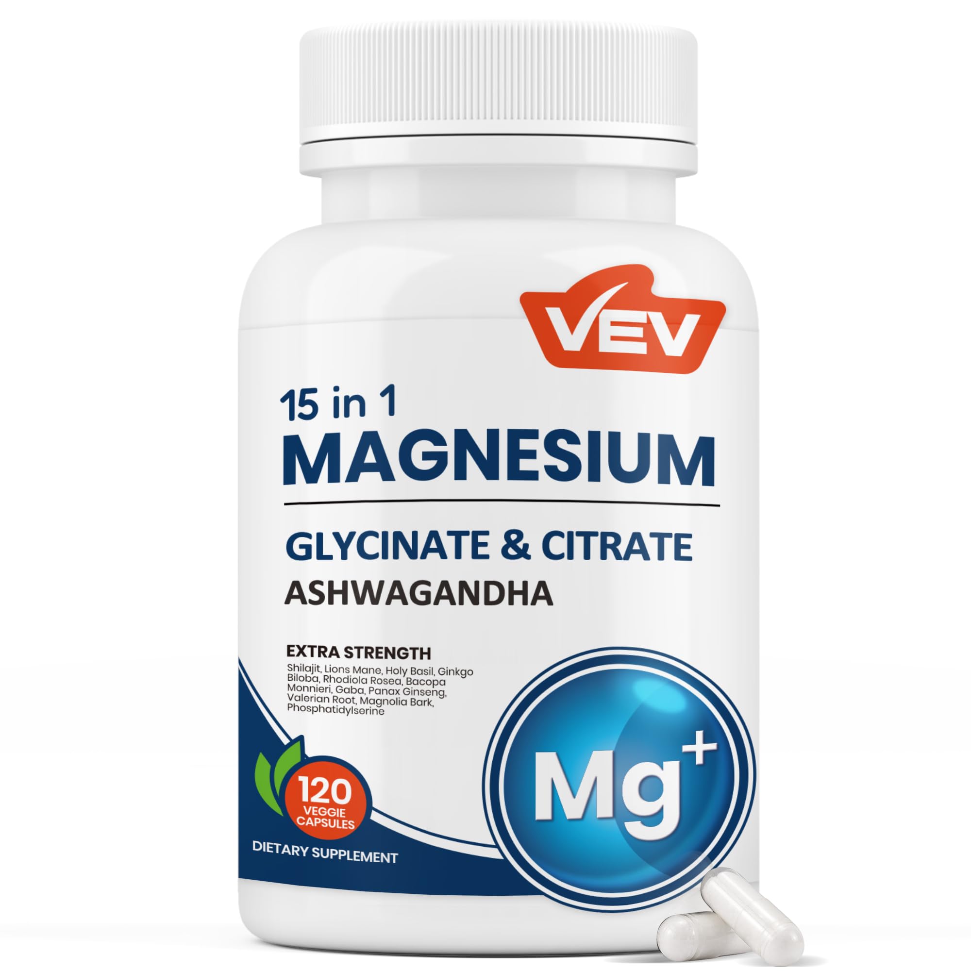 VEV 15 in 1 Magnesium Glycinate & Citrate Complex Capsules Cortisol Supplements for Women Easy to take Formula with Ashwagandha & L-Theanine 120 Vegan Capsules Blue