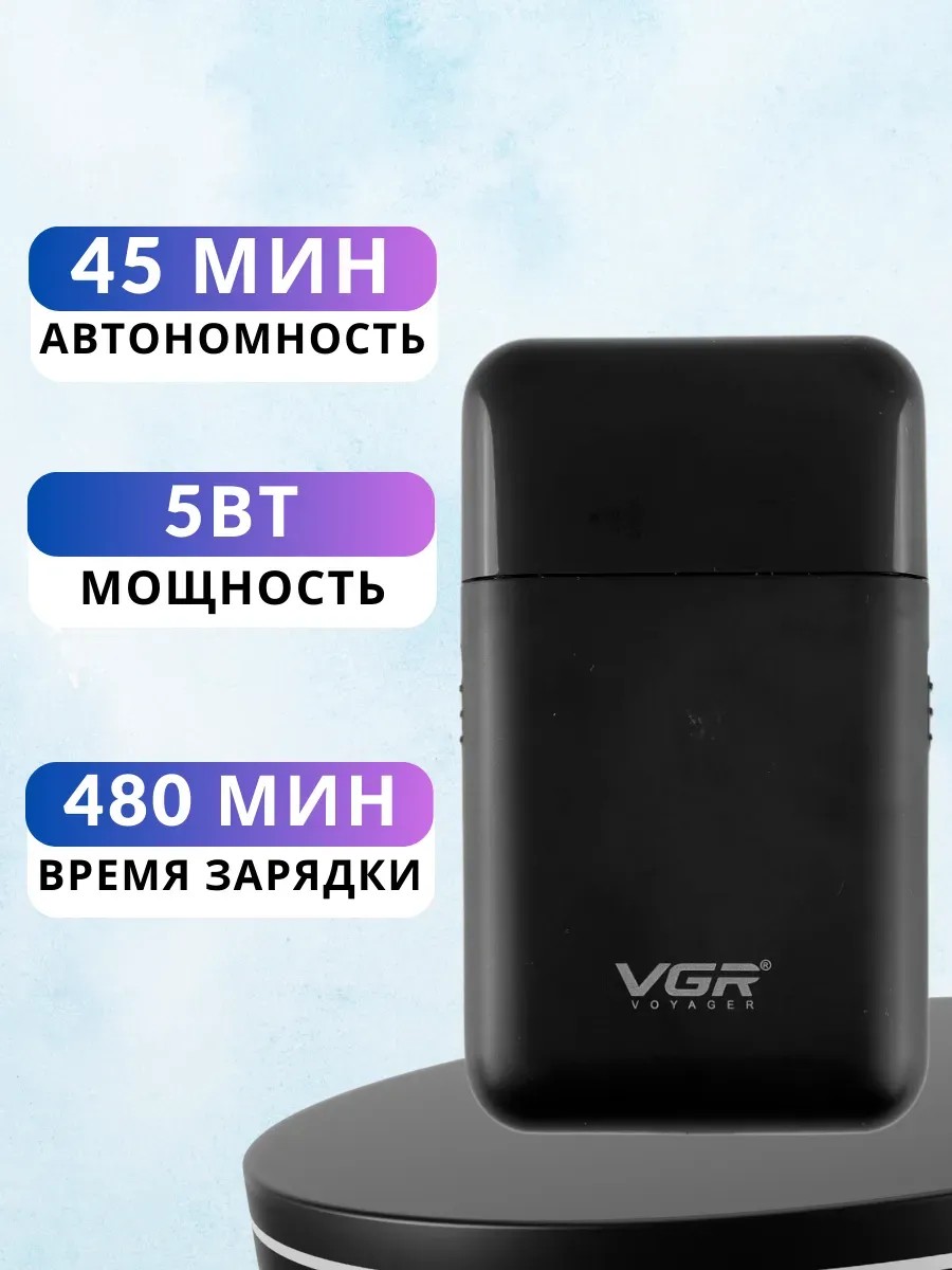 Компактная Электробритва VGR идеально подойдет для ежедневного использования, а также благодаря своей компактности подходит для людей часто бывающих в командировках, водителей такси и любителей путешествии. Триммер VGR - компактная бритва шейвер для окантовки и сухого бритья. Шейвер создан для поддержания гладкой кожи (сухое бритье щетины длиной до 3 мм). Сбоку бритвы имеется триммер, который справляется с любой длиной волос, а также позволяющий подравнять прическу, усы и бороду. Делая её уникальной в своем роде. Время работы шейвера до 60 минут. Специальное покрытие корпуса soft touch невероятно приятно на ощупь. Роторный мотор совершает 6500 об/мин. Лезвие триммера - машинки для стрижки волос и бороды безопасна, и не оставляет порезов. Надежное устройство бритвы прослужит долгое время.