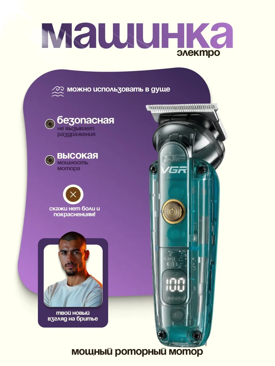Многофункциональная машинка VGR V-102 для стрижки волос. Сочетает в себе несколько устройств: - Профессиональная машинка для стрижки волос с четырьмя насадками от 3 до 12 миллиметров - Триммер с узкими ножами для художественного бритья - Триммер для ушей и носа - Насадка, которая превращает машинку в сеточную бритву с головкой на 3-4,5 мм В многофункциональной бритве используются качественные ножи из нержавеющей стали для долгой и надежной работы. ХарактеристикаДлительная работа Ножи из нержавеющей сталиИндикатор зарядки аккумулятора Аккумулятор: литиевая батарея 600 mAh Дисплей Быстрая зарядка Время зарядки 2 часа Время работы: 150 минут Ширина лезвия: 40 мм Работа без шнура Малый вес и габариты Легко ложится даже в небольшую ладонь Долговечный и высокопроизводительный Минимальная высота среза 0.1 ммРаботает от сети 100 ,240 В Мощность 3ВтРазмер 15,7*4,6*4,4 см.