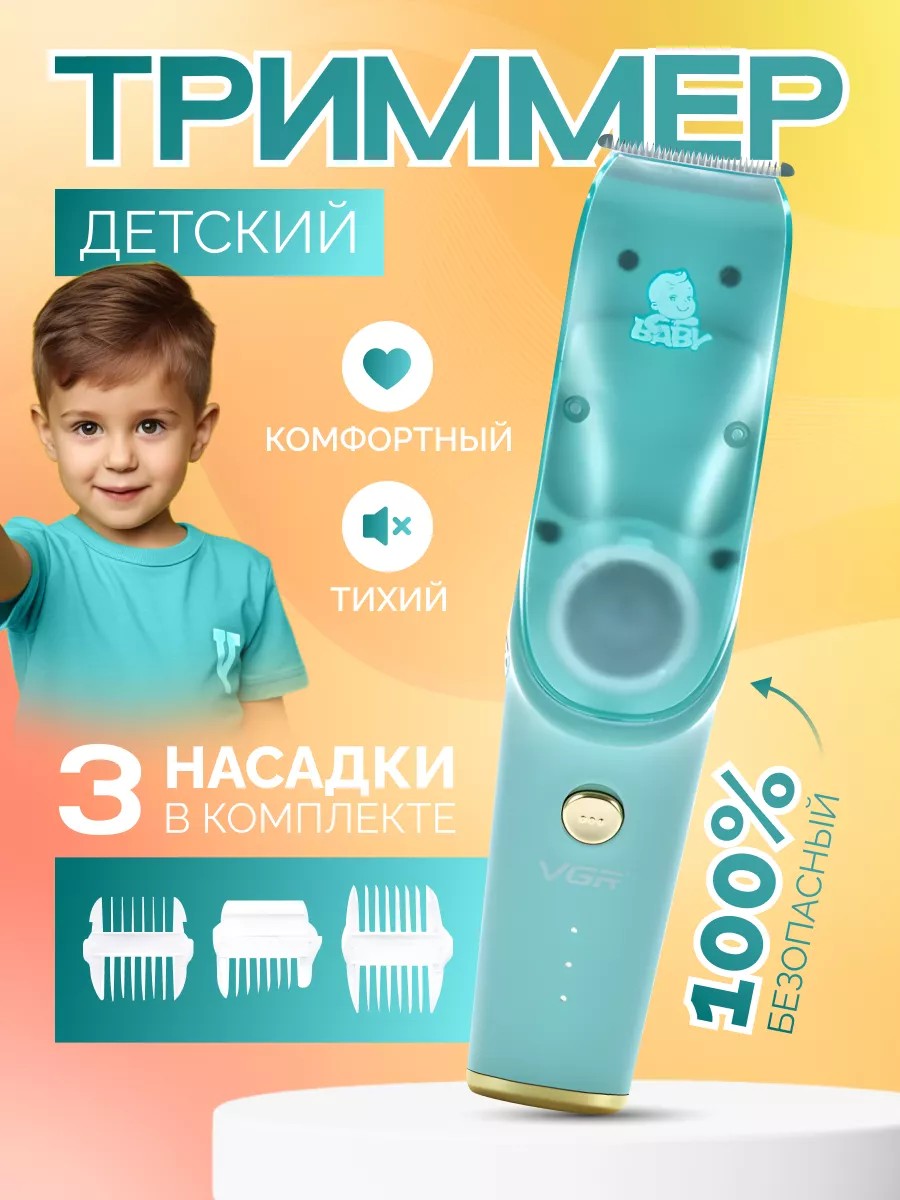 Аккумуляторная детская машинка для стрижки волос VGR V-151 с пониженным уровнем шума и функцией сбора отстриженных волос, насадками для аккуратной и бережной стрижки детей с самых малых лет. Триммер для стрижки для детей разработан для ухода за младенцами и детьми, который безопасно и аккуратно срезает мягкие волоски вашего малыша, не повреждая нежную кожу. Конструкция миниатюрной машинки для стрижки обеспечивает безопасность и полный комфорт во время стрижки. Специальная R-образная форма головки, с круглым углом, и керамическое лезвие позаботятся о чувствительной коже вашего ребенка. Сами лезвия плотно прилегают друг к другу, что не позволит ножам зажимать отдельные волоски. Также все волосы попадают в специальный отсек с режимом всасывания, что позволяет стричь волосы максимально комфортно и безопасно для вашего ребенка.