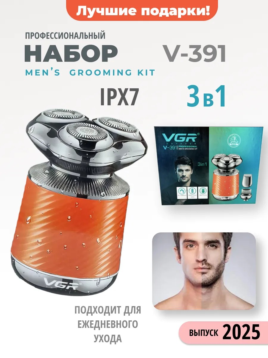 Электрическая бритва 3 в 1 VGR V-391. Сочетает в себе три функции: электробритва мужская, триммер для бороды и усов, щетка для пилинга. Многофункциональный прибор обеспечивает безупречный уход за лицом и бородой. Благодаря гибким плавающим головкам, которые точно повторяют контуры вашего лица, процесс бритья становится легким и комфортным. Бритва идеально подходит для чувствительной кожи и не вызывает раздражения, что делает её отличным выбором для ежедневного использования. Компактный и легкий (всего 145 г помещается в любую сумку, идеален в поездках. Дополнительным преимуществом является класс водостойкости IPX7: вы можете легко очищать бритву под струей воды или даже использовать её в ванной. Литиевая батарея с емкостью 550 мАч обеспечивает до 60 минут работы без подзарядки, а всего 1,5 часа — достаточно для полной зарядки. LED-индикатор показывает состояние заряда. В комплекте идет насадка-триммер, с помощью которой вы сможете создавать стильные формы бороды и усов, а также насадка-щетка для пилинга, которая обеспечит глубокую очистку кожи лица. Эргономичная ручка обеспечивает надежный захват, что предотвращает выскальзывание из рук во время использования. Защитная крышка надежно защищает бритвенную головку от загрязнений в процессе хранения. Отличный подарок мужчине на 23 февраля, день рождения, на любой праздник