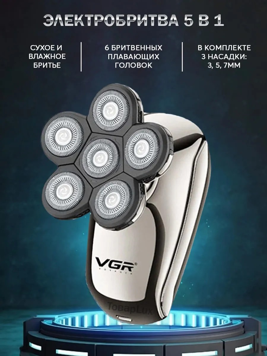 Электробритва для бритья VGR V-320 5 в 1. Имеет помимо бритвы много дополнительных насадок, таких как, прецизионный триммер для волос, с дополнительными насадками для регулировки длины волос, триммер для носа, вспомогательную систему для чистки лица от ороговевших клеток, дополнительную силиконовую насадку чувствительной кожи. Водонепроницаемая бритва, для влажного или сухого бритья. Подходит для бритья головы. 100 В-240 В напряжение, светодиодная подсветка, 2 часа зарядки. Поддержка USB-зарядки, долгий срок службы. Быстро и удобно. Автоматическая технология шлифования. Умное шумоподавление. Уровень шума и вибрации снизился до 60 Дб характеристики: Бренд: VGR. Модель: V-320. Тип: Роторная. Бритье: Влажное/Сухое. Съемный триммер. Бритвенных головок: 6 Плавающая головка Материал лезвий: Нержавеющая сталь+ ABS Источник питания: Аккумулятор Время работы: 120 мин Время зарядки: 2 часа. Комплектация: инструкция 1шт; кабель USB 1шт; насадки 3, насадка расческа 3шт; Электробритва 1шт.