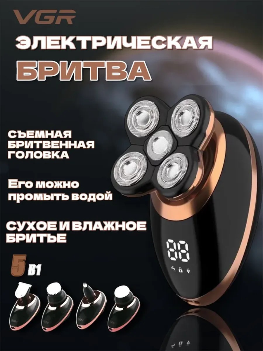 Бритва VGR V-316 имеет 5 дополнительных насадок, которые позволят вам легко справится с любыми сложными участками кожи. Электробритву удобно брать с собой в дорогу так как аккумулятора на долго хватает.-Низкий уровень шума.-Подходит для сухой, а также влажной кожи.-Индикатор зарядки и подсветка.-Съемная бритвенная головка для легкой очистки и ухода.-Точный триммер для безопасной, комфортной окантовки бороды.-Плавающий триммер для бакенбард.-Водонепроницаемость. Можно мыть непосредственно с помощью водопроводной воды.-Вращающаяся головка 5D. Двойное кольцо независимое плавающее лезвие. Умная плавающая система,360 градусов.-Двойное кольцо для бритья волос, плавающая сеть ножей, делает бритье более безопасным и комфортным.