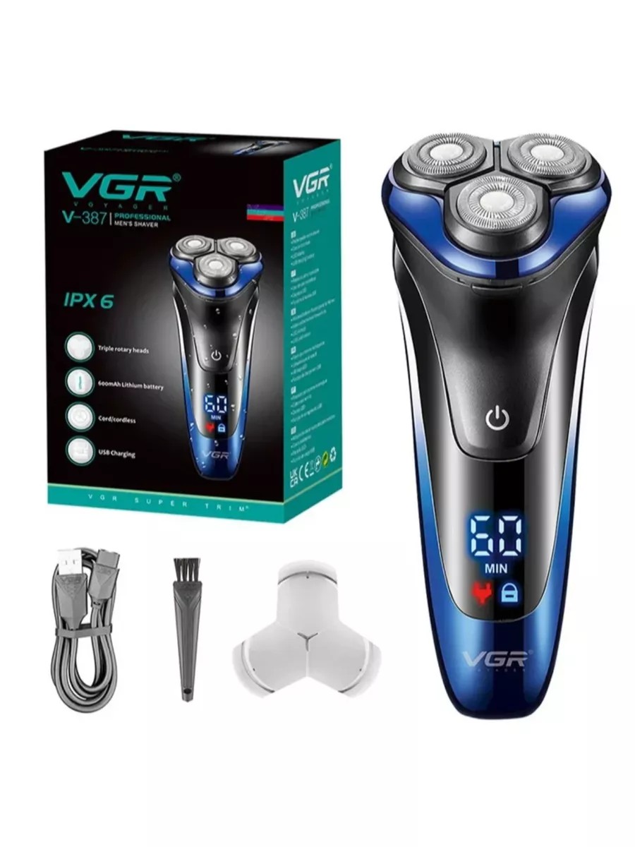 Водонепроницаемая аккумуляторная электробритва V-387 позволит Вам бриться стоя под теплыми струями душа. Три плавающих головки подстраиваются под контуры лица, не повреждают кожу. После бритья их защитные сеточки открываются и промываются водой. С обратной стороны бритвы размещен триммер, который открывается легким нажатием. Вы всегда сможете подровнять контуры висков, усы, бороду