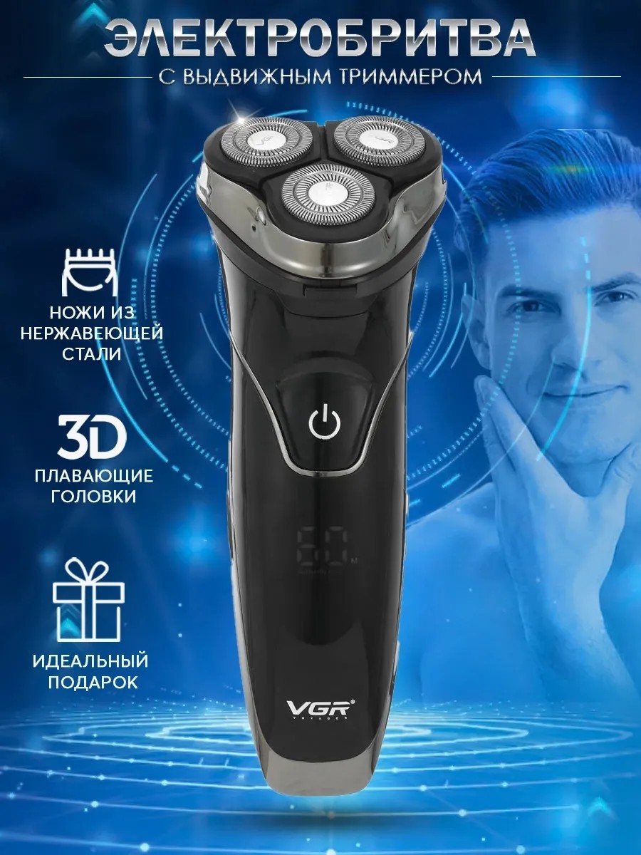 VGR V-318 Electric Shaver The waterproof V-318 electric razor will become an indispensable assistant for the modern man in his quest for a perfect look anywhere. The main advantage of this electric razor is that you'll forget about irritation forever—it's the ideal solution for sensitive skin. The razor perfectly follows every curve of the face, ensuring a flawless shave. You can use it on your face, neck, and even your chin, forever forgetting about shaving. This cordless electric razor is easy to take with you on trips, as it's compact and fits perfectly in any bag. It can be used either corded or cordless. The IPX6 water resistance rating makes the shaver easy to clean under running water. Key features: - Stainless steel blades; - USB charging cable; - IPX6 waterproof; - 600 mAh lithium battery; - Smart LED display shows the remaining battery, reminds you to charge, reminds you to clean the shaving heads, travel lock; - 90-minute runtime; - Quick charge in just 1 hour; - 8 W power; - Wet and dry shaving; - Self-sharpening blades; - Pop-up trimmer; - Corded and cordless use; - 3D flexible heads follow the contours of the face; - Double ring network of shaving heads; - Ergonomic handle for easy use; - Protective cover to keep the shaving head clean between shaves.