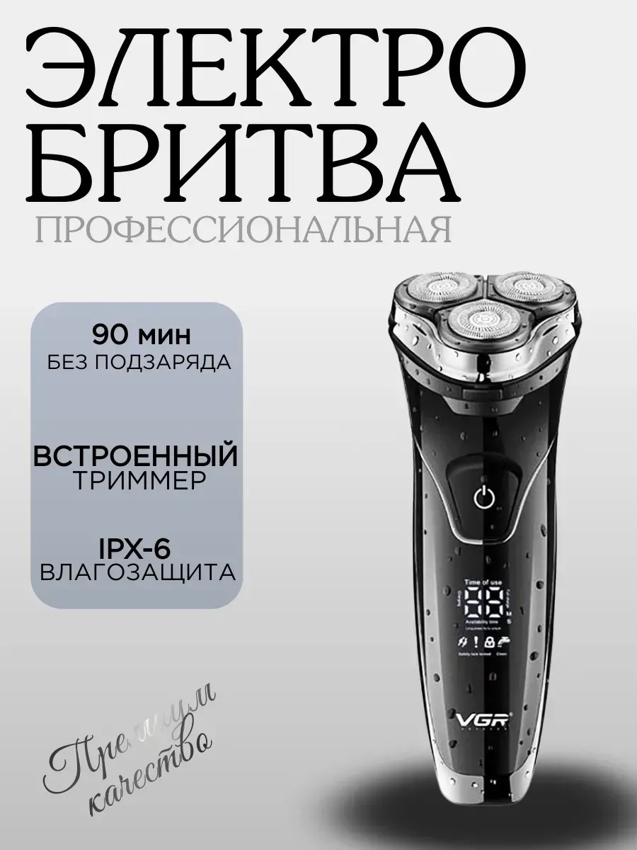 Электробритва VGR V-318 – это профессиональное устройство, которое позволяет добиться идеального бритья в домашних условиях. Три плавающие 3D-головки обеспечивают максимальное прилегание к коже, удаляя волосы даже в самых сложных зонах. Встроенный триммер делает устройство универсальным, позволяя не только бриться, но и подравнивать бороду и усы. Корпус из ABS-пластика легкий и прочный, что делает бритву удобной для ежедневного использования. Устройство поддерживает как влажное, так и сухое бритье, а водонепроницаемый корпус с защитой IPX6 позволяет использовать его под душем. Автономная работа до 90 минут и быстрая зарядка за 1 час через USB-кабель обеспечивают удобство в любых условиях. Индикатор заряда и дисплей помогают контролировать уровень батареи и время работы. В комплекте вы найдете зарядный кабель, чистящую щетку, защитную крышку и мешочек для хранения.