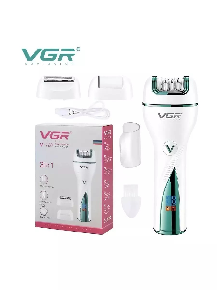 Женский электроэпилятор 3 в 1. Имеет 3 насадки - бритва, пилка и соответсвено эпилятор. Насадка электробритвы может качествено выполнять функции депиляции, т.к. имеет хорошее лезвие, а мощный мотор 5 Вт подходит для всех типов волос, с легкостью удаляет длинные и короткие волосы. Электро станок с насадкой эпилятора имеет 18 пинцетов и отлично справляется с задачей эпиляции, как триммер или депилятор. В свою очередь аппарат с насадкой пилки(пилочки) эффективно выполняет функцию пилинга для пяток и многих других частей тела. Предусмотрена одна скорость работы. Удаляет волосы в интимной зоне бикини, ног, лица. Такая техника имеет более долгий эффект, чем лазерный депилятор. Такая бытовая техника поможет долго сохранять женскую красоту и здоровье