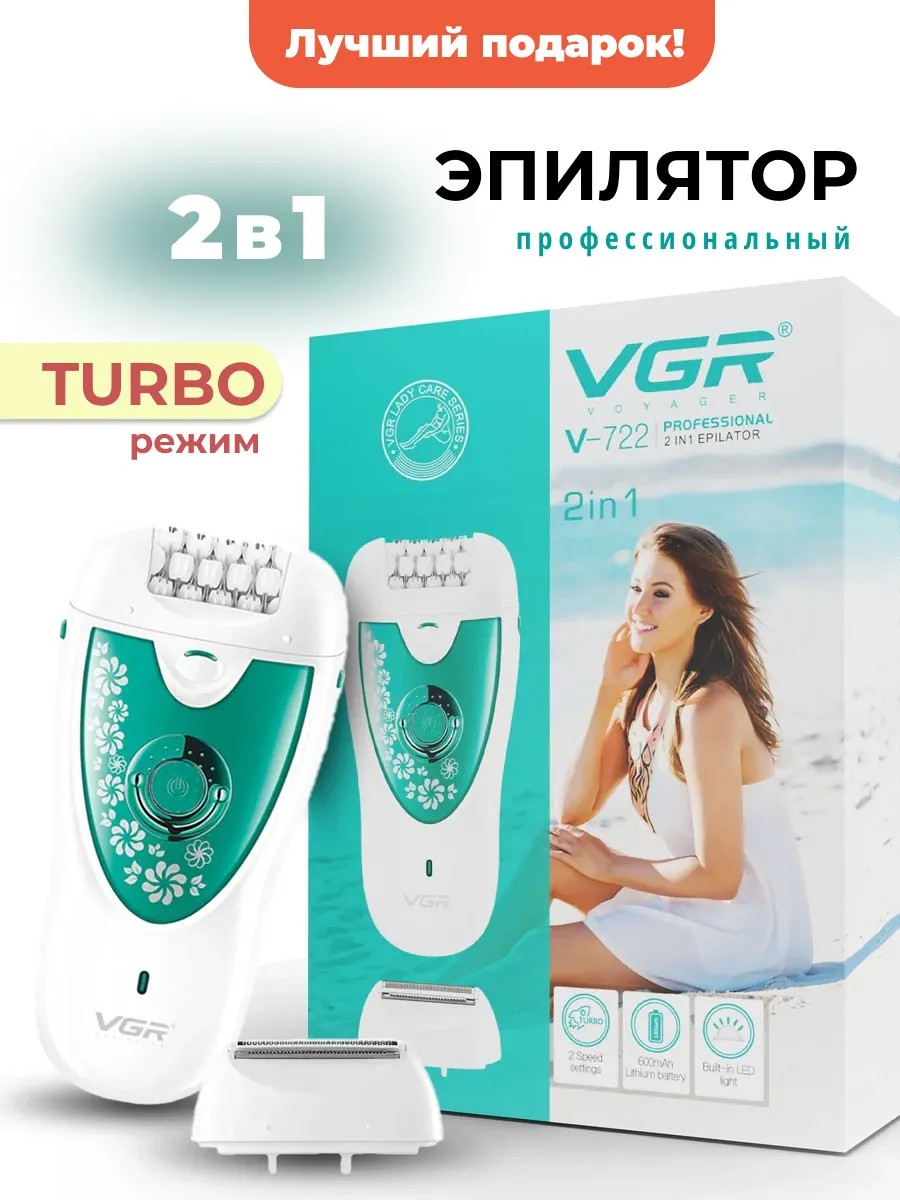Женский набор 2 в 1 VGR V-722 - это многофункциональный прибор для женщин: электроэпилятор и бритва с шейвером. Предназначен для удаления нежелательных волос на различных участках тела, включая лицо, зону бикини и подмышечные впадины. Универсальный женский эпилятор VGR V-722 работает от аккумулятора. Аккумуляторный режим работы позволит использовать устройство где угодно, не ограничивая вас проводами, емкая батарея 600 mAh обеспечивает непрерывную работу в течении 50 минут. Зарядить легко от любого устройства в течении 1,5 часов. Эпилятор для удаления волос имеет 32 пинцета, что позволяет зацепить все волоски от женских до самых маленьких. А две сторости позволяет выбрать комфортный режим именно для Вас. Компактный размер всего, легкий вес всего 150 гр. и эргономичная форма делают его удобным в использовании и хранении. Легко держать в руке, обеспечивая точные движения, особенно в труднодоступных местах. Удобно брать с собой эпилятор в путешествие, отпуск, в командировку. Как выбрать насадку? Эпилятор женский: Идеален для ног, рук и зоны бикини. Бритва женская : Подходит для чувствительных зон, таких как подмышки и линия бикини. Эпилятор VGR V-722 - это отличный выбор для тех, кто хочет иметь гладкую кожу надолго. Благодаря своей универсальности и эффективности, он станет незаменимым помощником в вашей косметичке. Отличный подарок женщине, девушке, подруге, маме, дочери