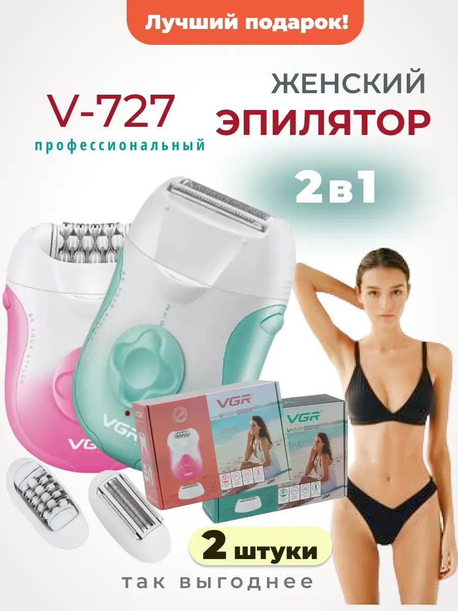 Set of 2. Women's 2-in-1 set VGR V-727 is a multifunctional device for women: an electric epilator and a razor with a shaver. Designed to remove unwanted hair on various areas of the body, including the face, bikini area, and underarms. The universal women's epilator VGR V-727 is battery-powered. The cordless mode allows you to use the device anywhere, without the limitation of wires, a capacious 600 mAh battery provides continuous operation for 60 minutes. Easily charged from any device within 1.5 hours. The epilator for hair removal has 32 tweezers, which allows you to catch all hairs, from women's hair to the smallest. And two speeds of 1200 rpm and 1500 rpm allow you to choose a comfortable mode just for you. The compact size of only 9.8 x 6.8 x 3.3 cm, lightweight only 150 grams. Its ergonomic shape and easy-to-use design make it convenient to use and store. It's easy to hold, allowing for precise movements, especially in hard-to-reach areas. It's easy to take the epilator with you on trips, vacations, or business trips. How to choose an attachment? Women's epilator: Ideal for legs, arms, and the bikini area. Women's razor: Suitable for sensitive areas such as the underarms and bikini line. The VGR V-727 epilator is an excellent choice for those who want long-lasting smooth skin. Its versatility and effectiveness make it an indispensable addition to your beauty kit. A great gift for a woman, girlfriend, friend, mother, or daughter.