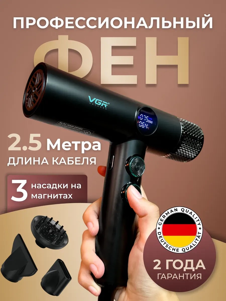 Мощный профессиональный фен стайлер 3в1 VGR — идеальный фен для волос профессиональный, созданный специально для стильных женщин, ценящих качество и мощность. Этот женский фен для волос с 3 сменными насадками — незаменимый помощник в ежедневном уходе за собой и создании потрясающих укладок.