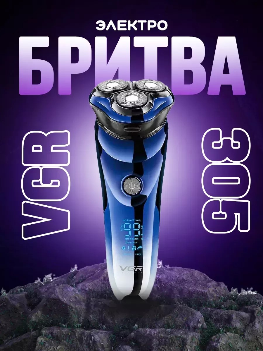 Откройте для себя новое качество бритья с нашей роторной электробритвой VGR V-305 для мужчин. Эта модель станет вашим надежным помощником в создании идеального образа. Благодаря компактному размеру и водостойкости, она идеально подходит как для домашнего использования, так и для путешествий. Подвижные бреющие головки мягко адаптируются к контурам вашего лица, обеспечивая максимальный комфорт и качество. Лезвия из японской нержавеющей стали гарантируют долговечность и отличное бритье. \\n\\nЭта электробритва оснащена защитой от воды IPX7, что позволяет использовать ее даже в душе или ванне без риска повреждения. Умный LED дисплей информирует вас о уровне заряда аккумулятора и состоянии лезвий, а встроенный аккумулятор обеспечивает до 90 минут непрерывной работы. Вы можете забыть о частой подзарядке, ведь этого времени хватит на несколько дней использования.\\n\\nВ комплекте вы найдете выдвижное лезвие для оформления бакенбардов и бороды, щеточку для чистки лезвий и удобный чехол для хранения. Эргономичный дизайн с ненавязчивой рукояткой обеспечивает легкость в управлении, а низкий уровень шума и вибрации делает процесс бритья поистине приятным. Эта модель станет отличным подарком для мужчин на любой праздник, будь то день рождения, 23 февраля или просто знак внимания. Надежное качество, стильный дизайн и комфорт - все это в одной бритве, которая превзойдет ваши ожидания.