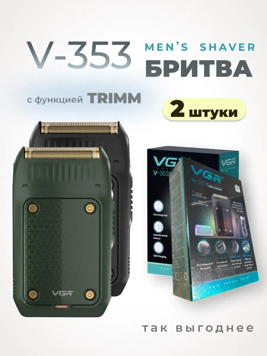 Набор 2 шт. Шейвер VGR V353 -. Эта мужская электробритва для бороды, тела и оконтовочный триммер объединяет в себе удобство, эффективность и качество. Благодаря роторной системе бритья, электробритва плавно скользит по контурам вашего лица, обеспечивая максимально близкое и аккуратное бритье. Система триммера с аккумуляторным питанием обеспечивает длительное время работы без подзарядки, что особенно удобно в путешествиях или в дороге. Встроенный триммер для окантовки позволяет стилизовать бороду и усы с высокой точностью и профессиональным качеством. Компактный и легкий корпус из пластика ABS делает эту электробритву портативной и удобной в использовании. Крышка защищает лезвия от повреждений и препятствует случайному включению. Комплектация включает в себя также кисточку для ухода и чистки бритвы. Наслаждайтесь идеальным бритьем каждый день благодаря этой потрясающей мужской электробритве. Дома, в гости, в дорогу, в путешествие берите с собой маленькую и удобную бритву. Отличный подарок мужчине на 23 февраля, новый год, день рождения, любой праздник.